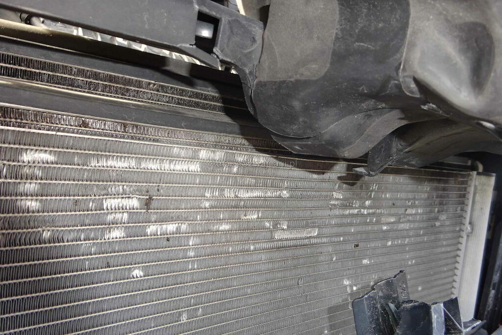 Capot, 2 ailes, 2 phares, pare-chocs, calandre, traverse, face av, condenseur, radiateur et spoiler endommagés