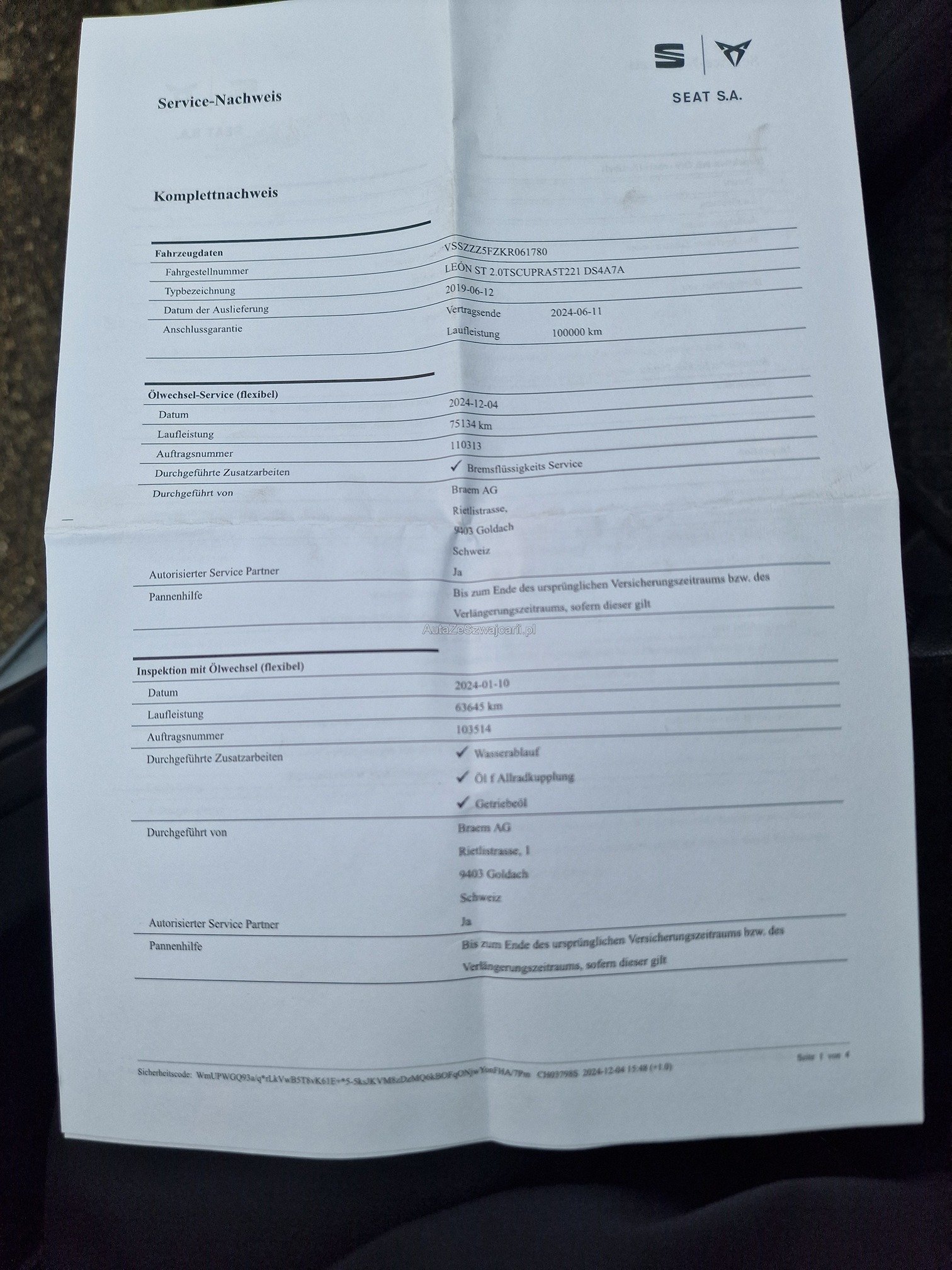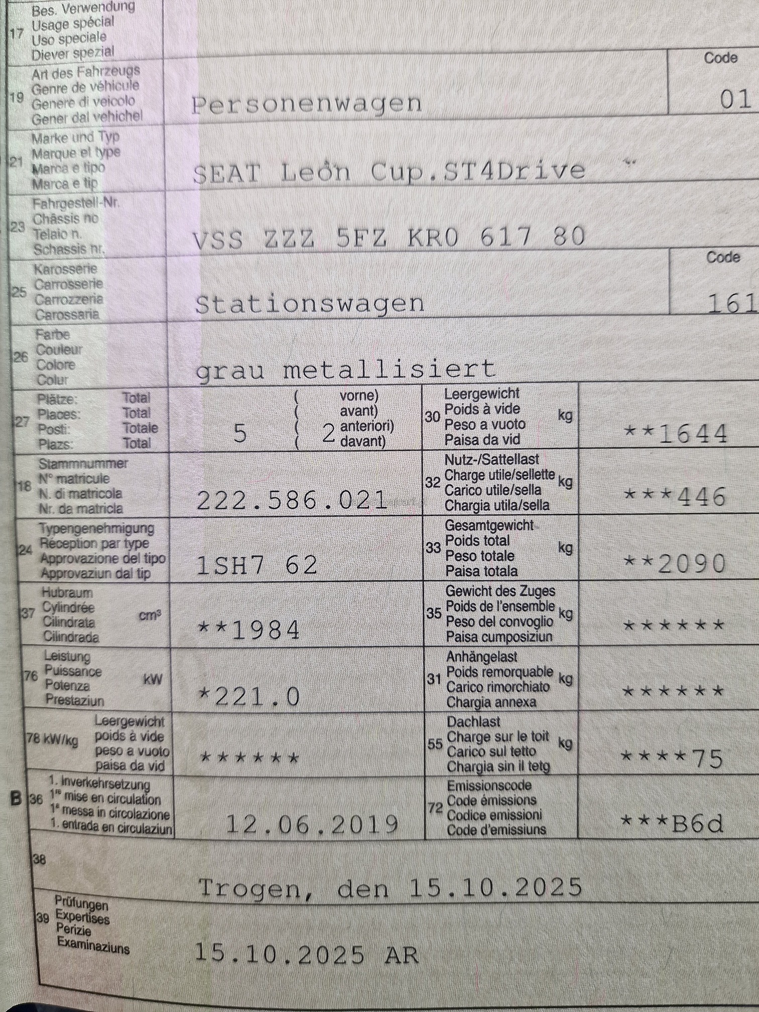 | Kommentar | - Rückfahrkamera, ACC, Navi, Beats Sound System, Keyless, CUPRA Schalensitze, etc. - Aussen und Innen kleinere Gebrauchsspuren gemäss Fotos - etwas wenig Kühlwasser, unten am Motor eingetrocknete Spuren von Wasserpumpe oder Wärmetauscher -> keine Diagnose durchgeführt! (gemäss Kunde wurde Wasserpumpe mal getauscht) - Fahrzeug noch im Kundenbesitz - Kein Eintauschtest / Diagnose durchgeführt - keine Nachverhandlung und / oder Nachwährschaft |