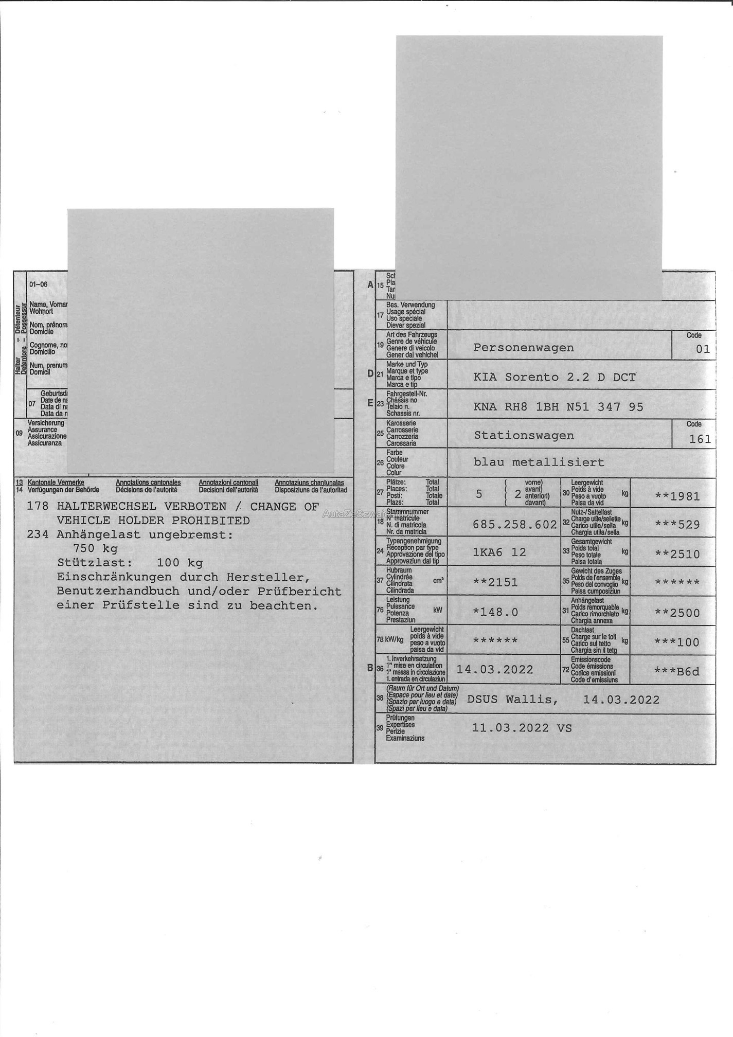 | Kommentar | mit Anhängerkupplung Anhängelast ungebremst: 750 kg / Stützlast: 100 kg Jede Gewährleistung wird wegbedungen. Wandelung und Minderung sind ausgeschlossen. Schadenersatzansprüche, gleich aus welchem Rechtsgrund, sind ebenfalls ausgeschlossen, soweit gesetzlich zulässig. |