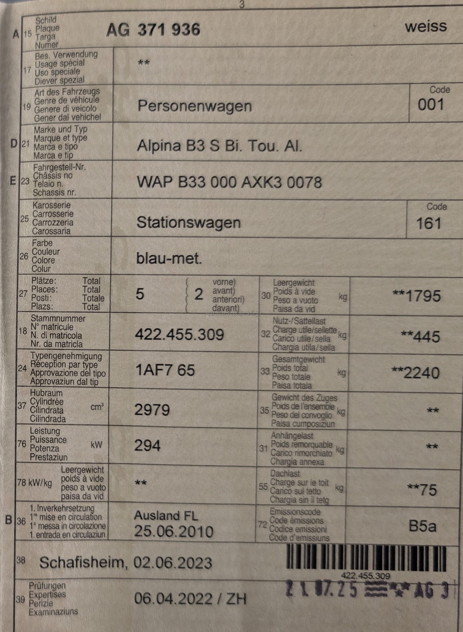 | Kommentar | Es wurde kein Eintauschtret gemacht. So wie auf den Fotos inseriert. Keine Nachverhandlung Inkl Originalen Alpina Felgen |