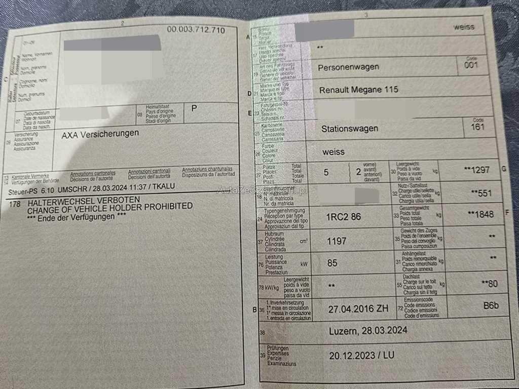 | Fahrzeugausweis | Vorhanden |