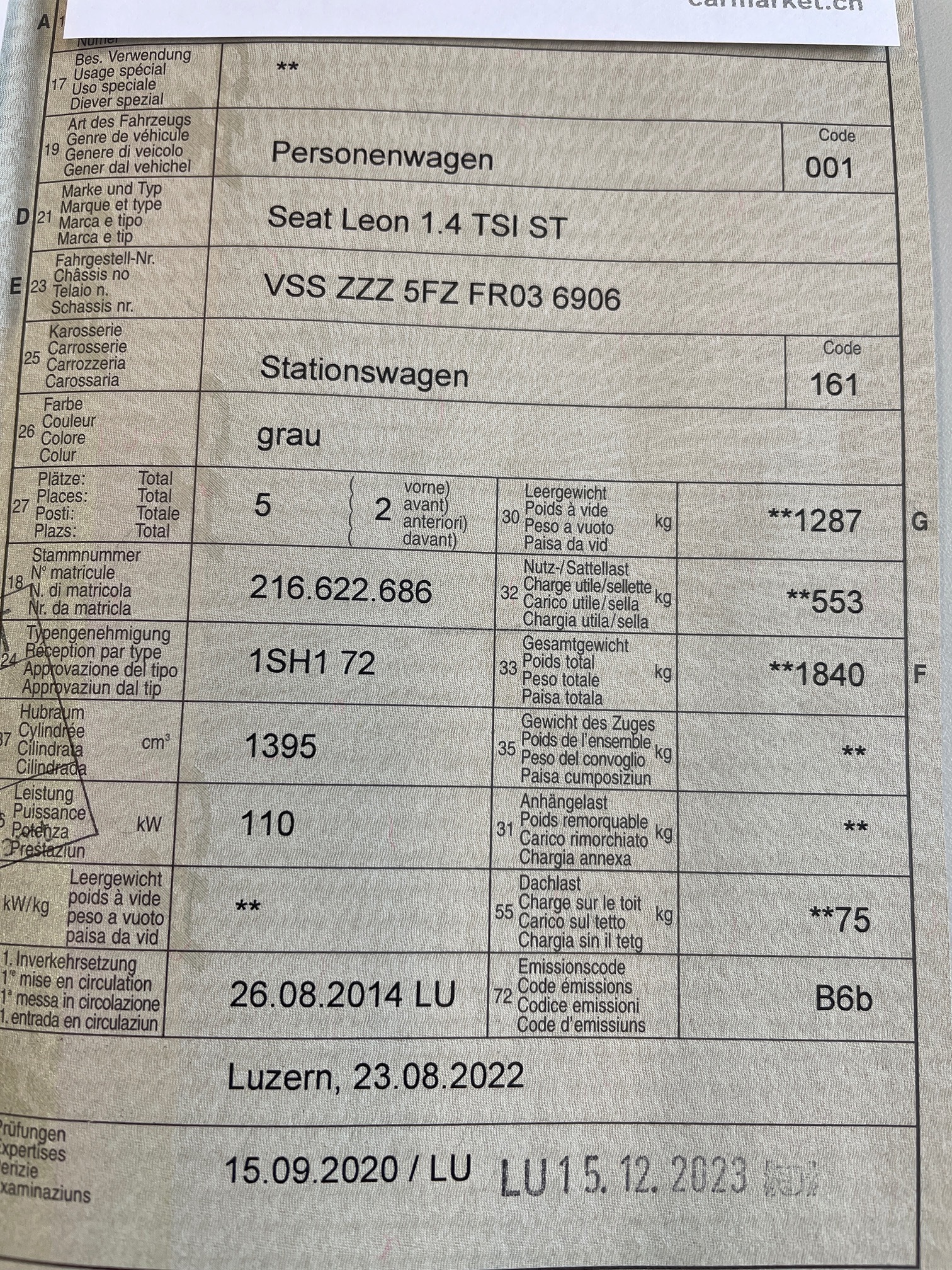 | Kommentar | Carosserie rechte Seite Radlauf hr. und Türe hr. Kratzer siehe Fotos. Service gepflegt vom Seat Händler. Sommerräder Profil ok. Reifen gemäss DOT Jahrgang 19. Kein Eintauschtest vorhanden. Letzter Service, 14.08.25 bei 112'149 Km. Nächster Service 08.27. |