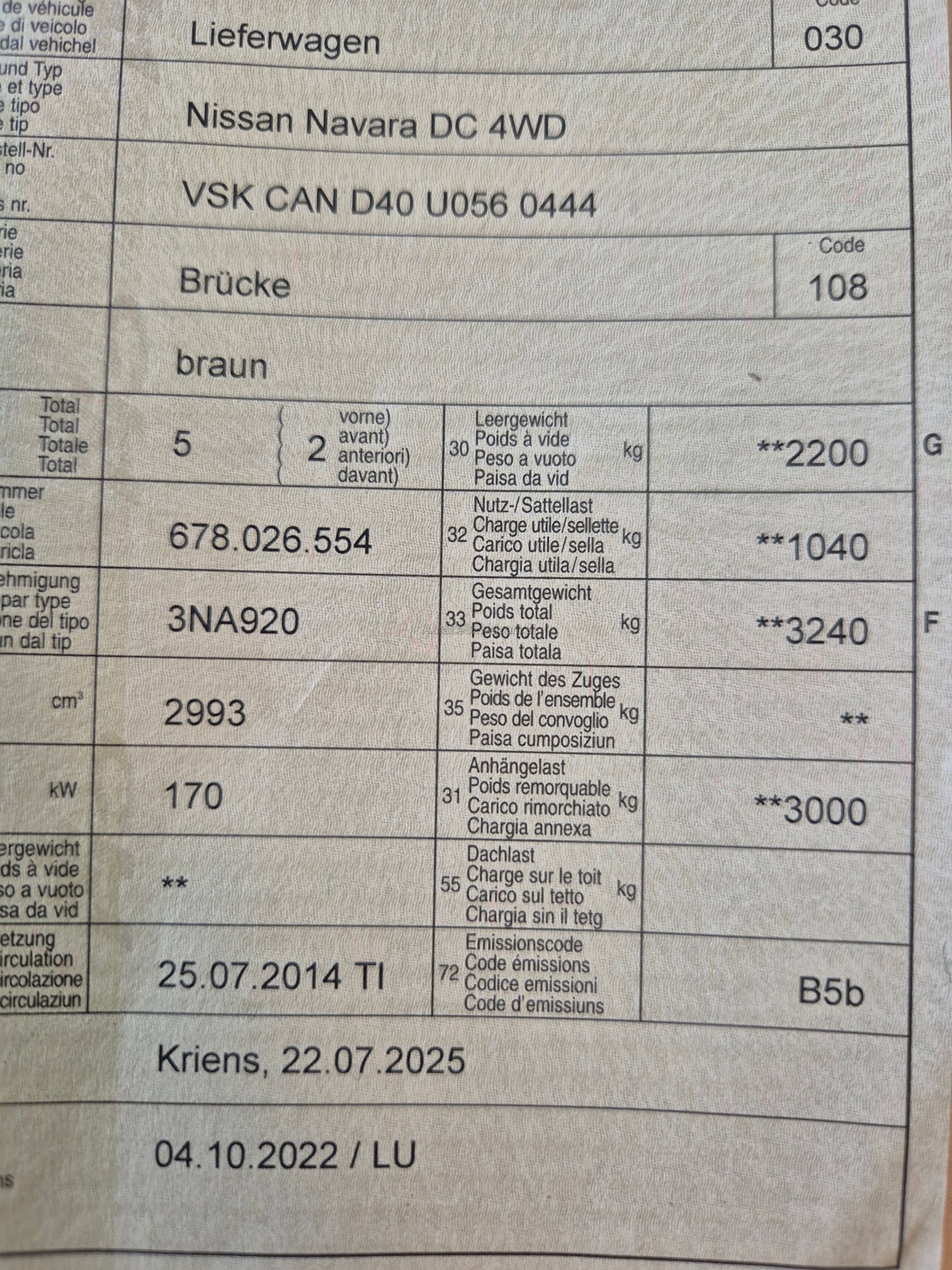 | Kommentar | Fahrzeug hat einen Motorschaden, Steuerkette ist gerissen Fahrzeug nicht fahrbar normale Gebrauchtspuren, Kratzer (siehe Foto) keinen Werkstatttest durchgeführt Fahrzeug ohne Garantie ab Platz Abholung nach Zusage innert 10 Tagen, ansonsten wir eine Standgebühr von 15.- Fr. pro Tag verlangt. |