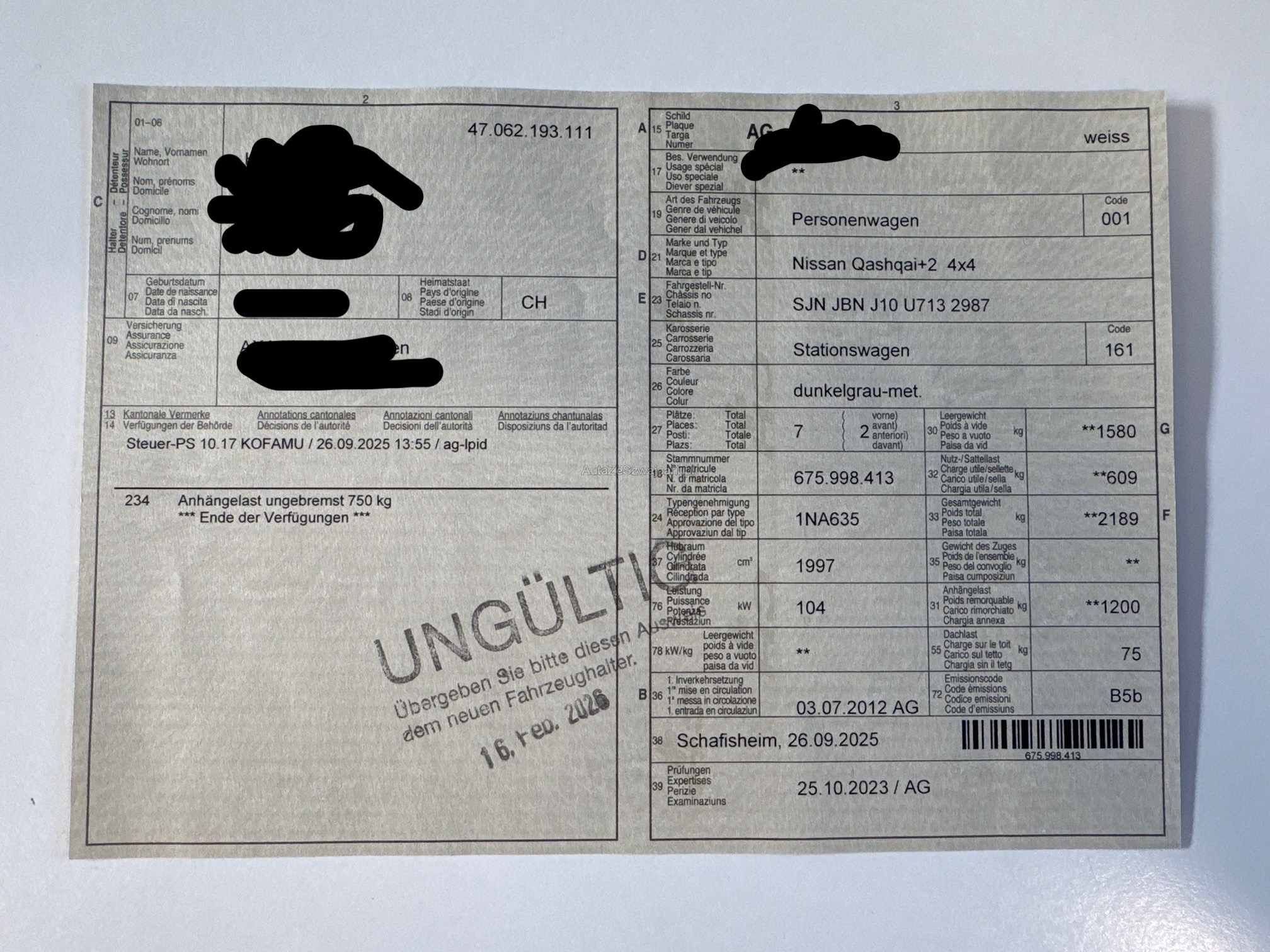 | Kommentar | Querlenker, Vorderachse, Service fällig, 2 Winterreifen an 4mm Grenze. Sitzwange Fahrersitz zu reparieren. Mit AHK und 8-fach bereift auf Alu. Liste ist nicht abschliessend resp. es wurde nicht weiter geschaut. Karrosserie schön, nur zwei drei kleine Parkdellen, siehe Fotos) |