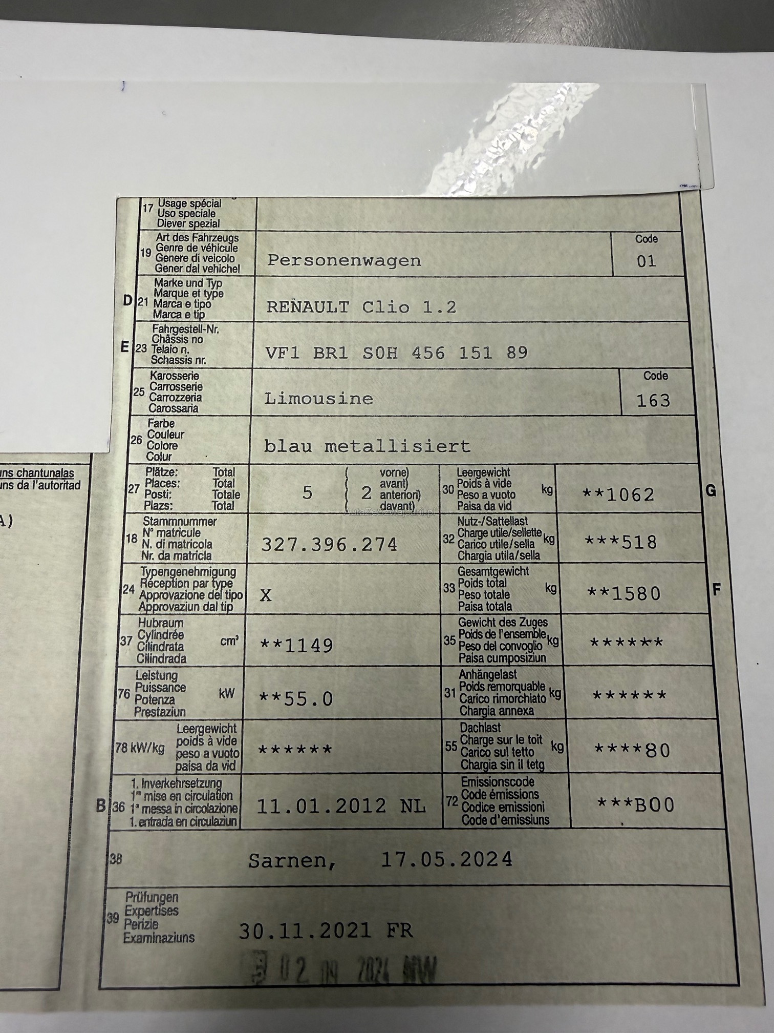 | Kommentar | Fahrzeug hat diverse Kratzer und Beulen, keine technische Prüfung. Ab Platz ohne Garantie. Jede Gewährleistung soweit nach Gesetz möglich wird wegbedungen insbesondere Wandelung und Minderung. Fahrzeug muss nach Kauf innerhalb 5 Arbeitstagen abgeholt werden. Standplatzgebühren 20.- |