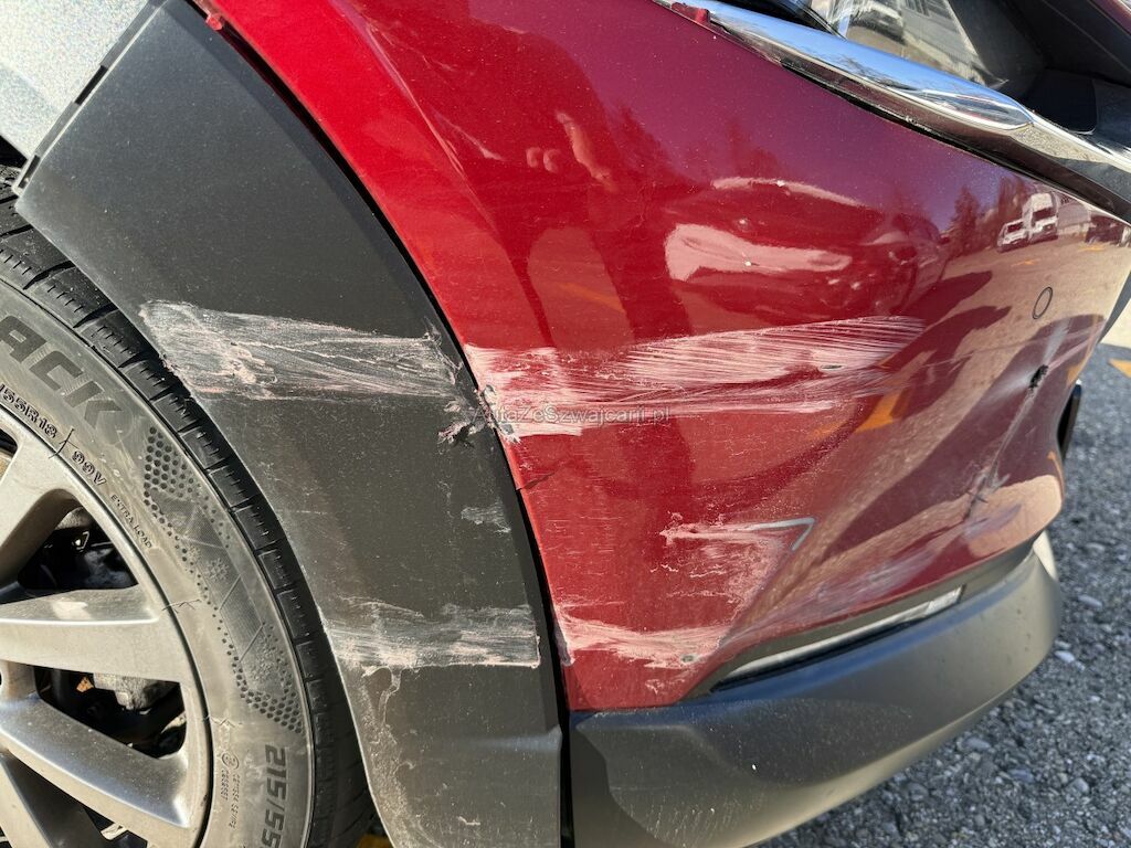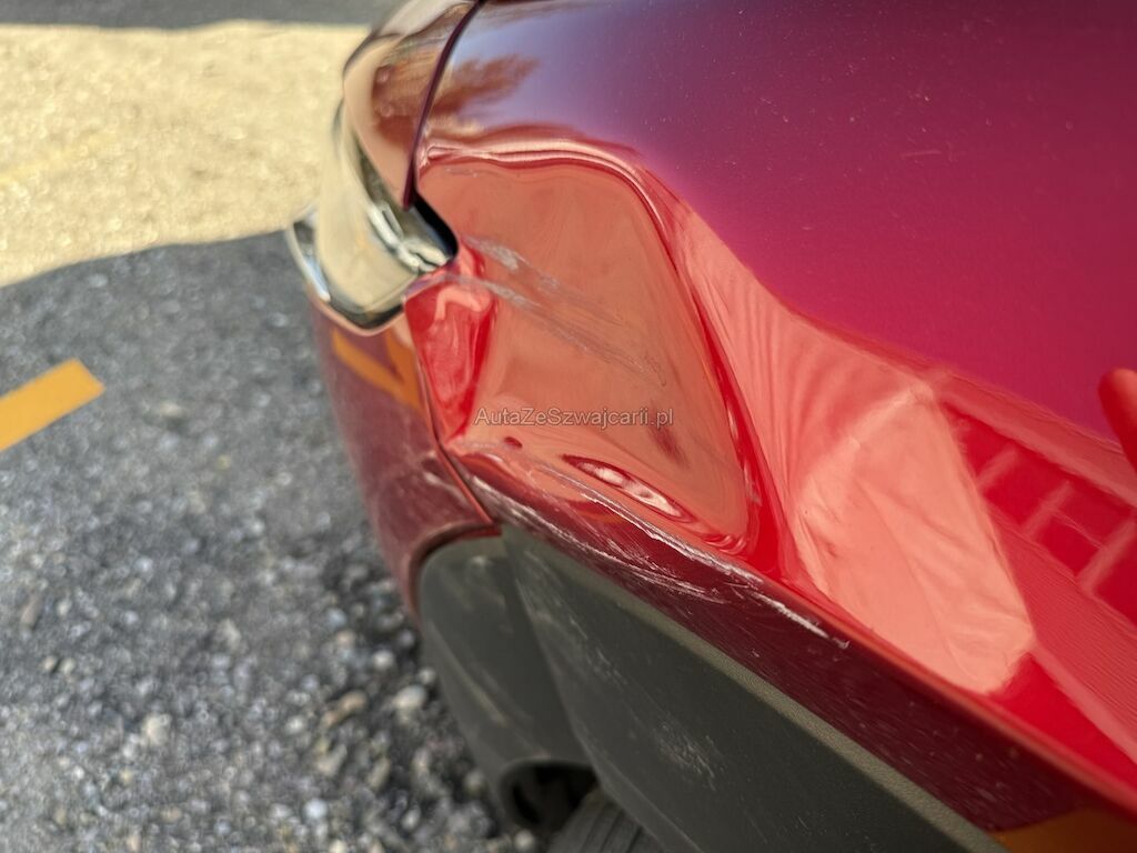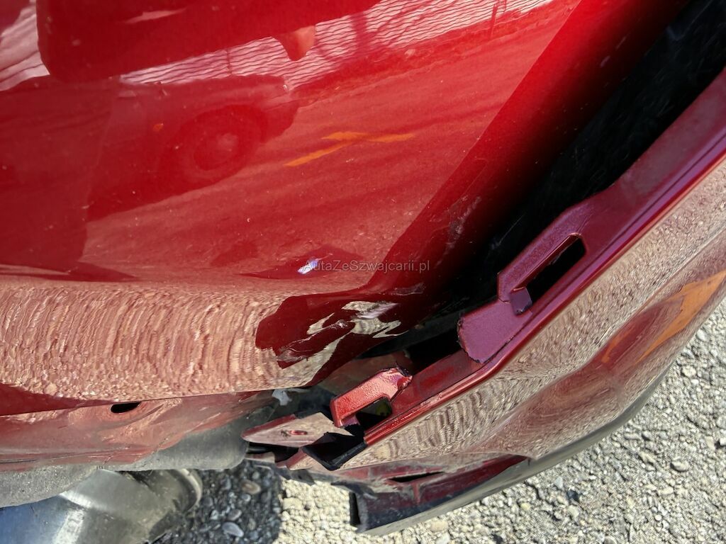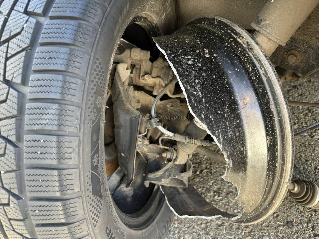 Schaden rundum: Stossfänger vorne rechts geschrammt. Leichtmetallfelge beschädigt. Kotflügel links eingedrückt. Scheinwerfer links beschädigt. Leichtmetallfelge beschädigt. Hinterachse links mit Leichtmetallfelge abgerissen. Reifen beschädigt. Stossfänger hinten geschrammt. Seitenwand leicht zerkratzt.