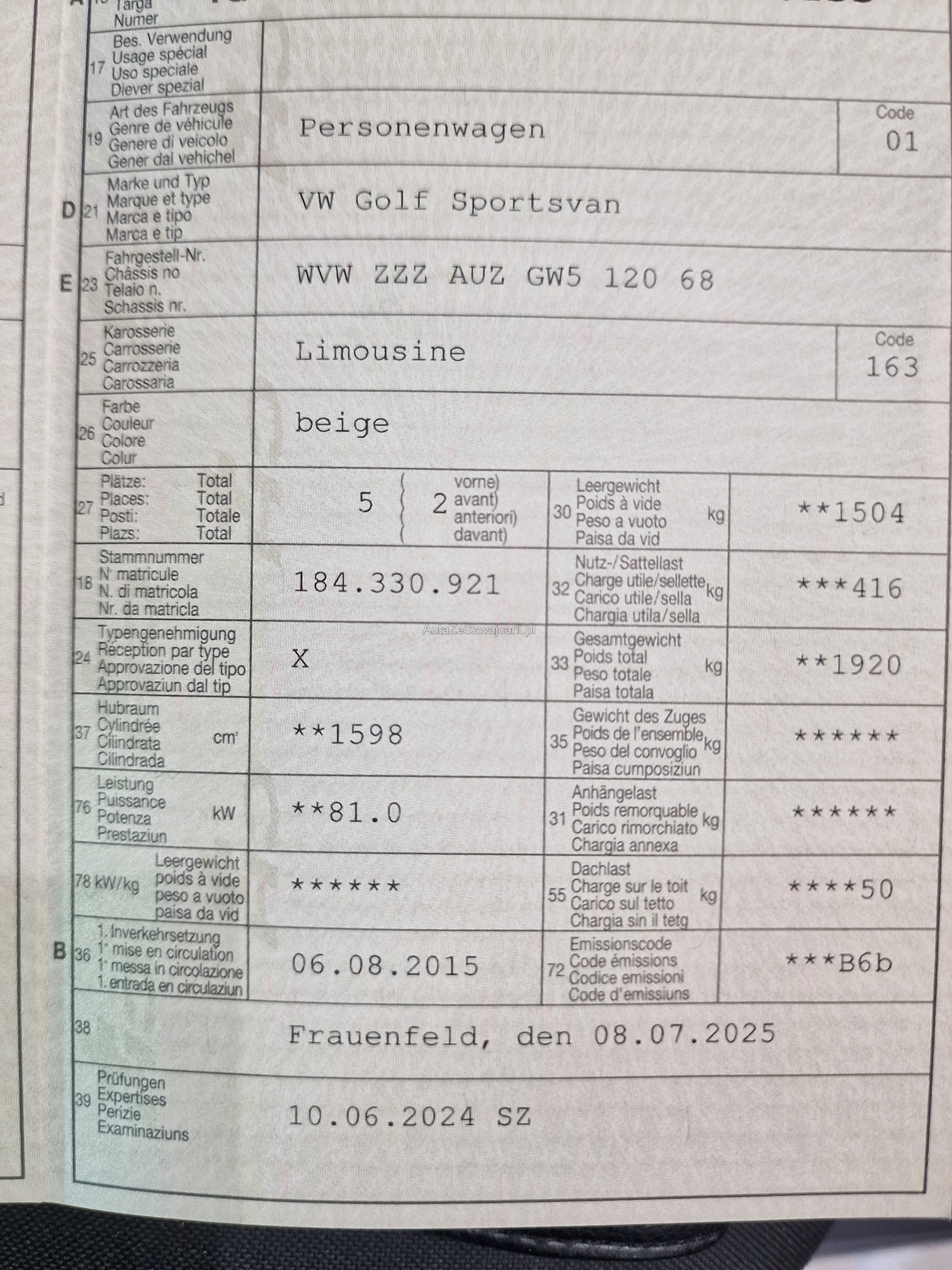 | VIN | WVWXXX |