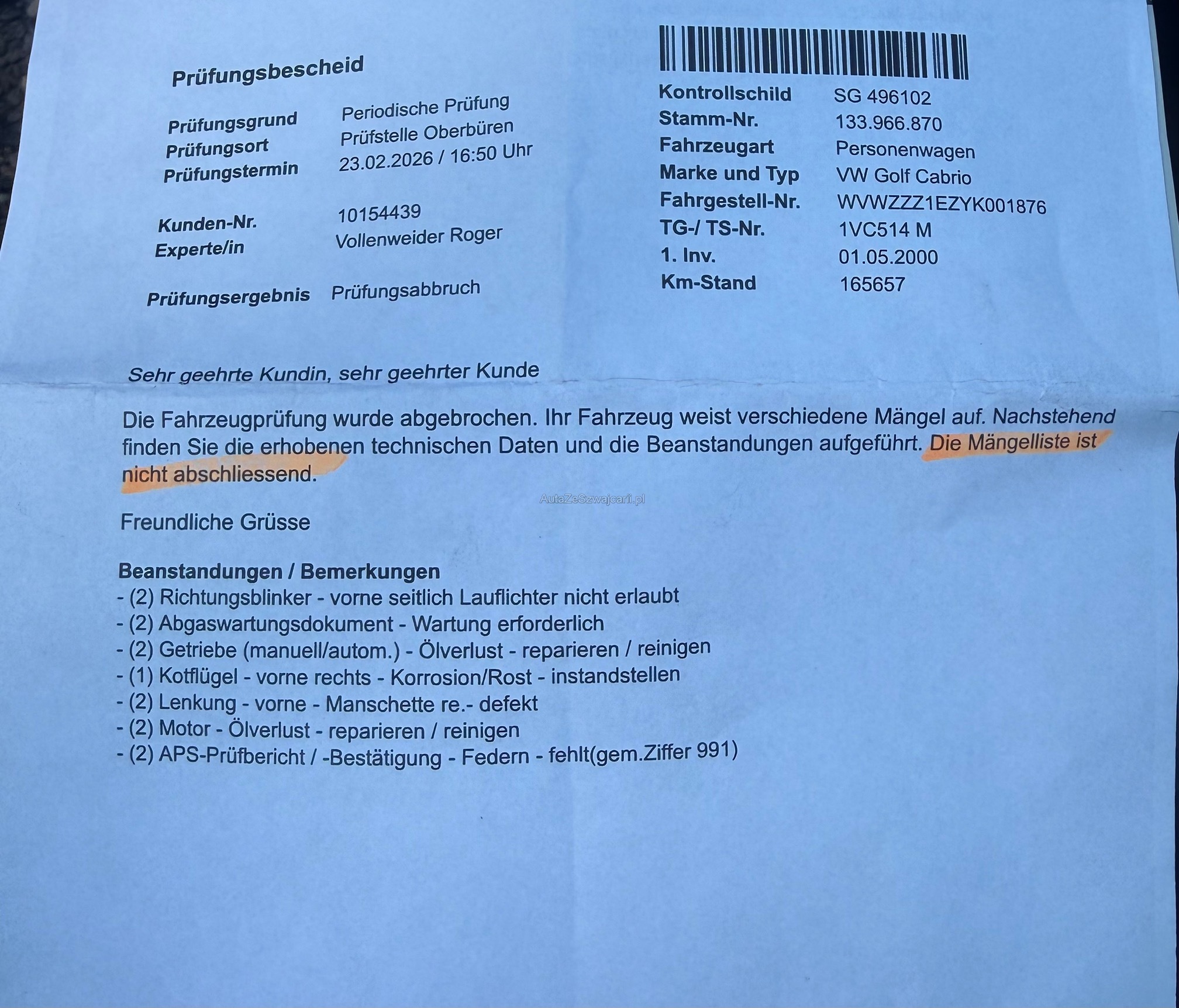 | Kommentar | Mängel MFK, Rost kotflügel, schweller links kleines rostloch |