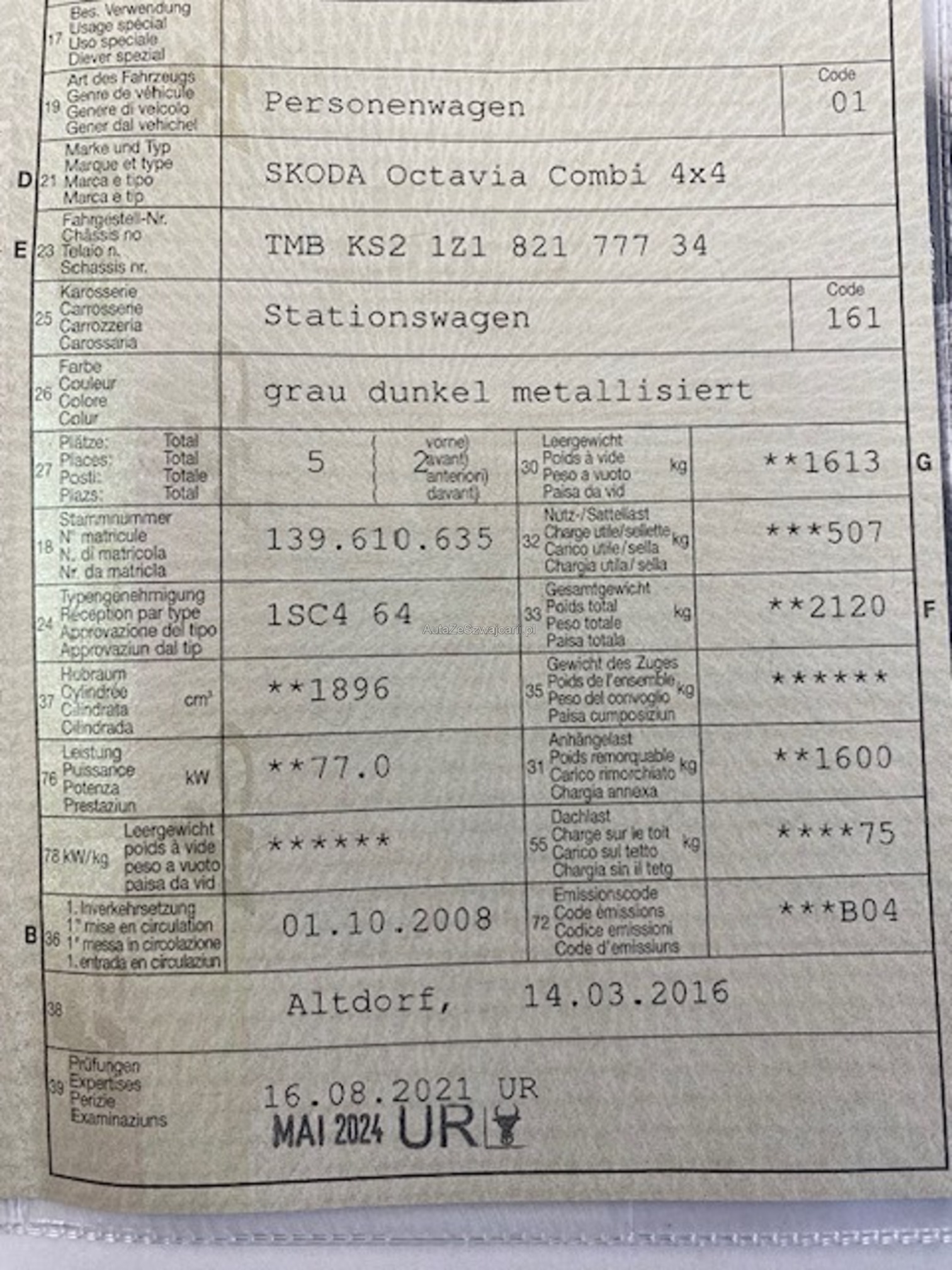 | Kommentar | Es handelt sich dabei um ein Occasion Fahrzeug das Gebrauchsspuren aufweist. In der Regel wird kein detaillierter Werkstatttest an den Fahrzeugen gemacht. Jede Gewährleistung, soweit nach Gesetz möglich, wird wegbedungen, insbesondere sind Wandelung und Minderung ausgeschlossen. Der Käufer bestätigt mit seinem Gebot, dies anzuerkennen und verpflichtet sich, das ersteigerte Fahrzeug umgehend gegen Barzahlung abzuholen. Der Preis ist fix und nicht mehr verhandelbar! Es wird grundsätzlich kein Werkstatttest durchgeführt. Nach Zuschlag muss das Fahrzeug innerhalb 5 Tage abgeholt werden, ansonsten werden Standgebühren von Fr. 20.- pro Tag verrechnet |