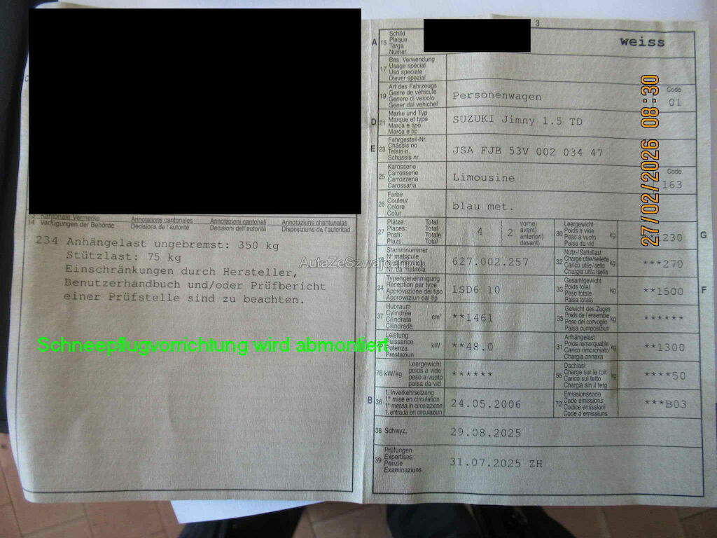 | Information | Gemäss Fotos. Wichtig: Notrad wird abmontiert. Schneepflugvorrichtung wird abmontiert. |