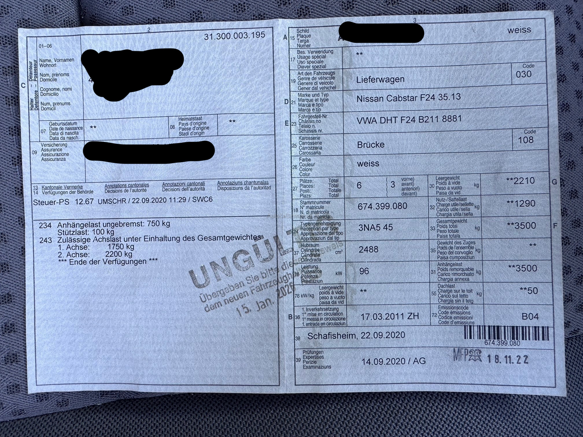 | Kommentar | Mangelbericht -> nicht abschliessend ROST Standlicht vorne rechts nicht i.O Rücklicht HL nicht i.O Hinten links Stossstange verbogen Beulen diverse vorhanden Bremsleitungen 7 Stück verrostet Stabi hinten Spiel Radlager VL Spiel Auspuffendtopf Löcher Rad hinten beidseitig Spiel Ladefläche unterbau verrostet Radlauf beidseitig vorne verrostet Reifen abgelaufen usw |