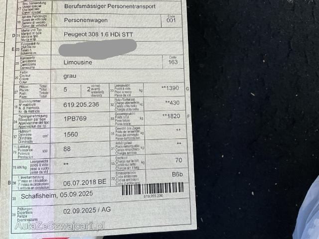 | Condition_and_Equipment | Verkauf Der Verkauf erfolgt durch den Halter in Zusammenarbeit mit der Firma TeamConsulting, nicht durch die XpertCenter AG. Das Fahrzeug muss bei Abholung bar vor Ort bezahlt werden. Zusätzlich zum Gebot fällt eine Handlinggebühr an. Zustand Fahrzeug muss transportiert werden (Höhe und Breite beachten). Weitere wichtige Hinweise Uber Tachograph wird ausgebaut.. --- Motor Motorschaden. --- Serienaustattung Airbag Fahrer und Beifahrerseite Elektrische Fensterheber vorne + hinten Aussenspiegel elektrisch verstellbar und heizbar Servolenkung Seitenairbag Fahrer und Beifahrerseite Nebelscheinwerfer Zentralverriegelung mit Fernbedienung Höhenverstellbare Vordersitze Lederlenkrad Lenkrad verstellbar Kopfairbag vorne und hinten Leichtmetallfelgen 16" Deaktivierung Beifahrerairbag Aussenspiegel elektrisch anklappbar ESP/ ASR Lendenwirbelstütze Fahrersitz Rücksitze geteilt umklappbar ABS und EBV Elektr. Bremskraftverteilung inkl. BA Pack Visibilité Zwei Zonen-Klimaautomatik Mittelarmlehne vorne mit Staufach Dieselpartikelfilter Kindersitzverankerung ISOFIX hinten Head-Up Display Reifendruck-Sensoren RDS Berganfahrhilfe Elektrische Parkbremse Einparkhilfe hinten Touchscreen-Bildschirm Stop + Start System Einparkhilfe vorne USB-Anschluss Bluetooth Freisprecheinrichtung Geschwindigkeitsregler und - begrenzer programmierbar Keine Gewähr auf die Angaben der Serienausstattungen Pack Confort Verkehrsschild-Erkennungssystem Apple Car Play/ Android Auto Navigationssystem/ Peugeot Connect Garantie 3 Jahre/ 80'000 km Pack Safety Sonderausstattung Metallic-Lackierung Pack Electrique/ Semi |