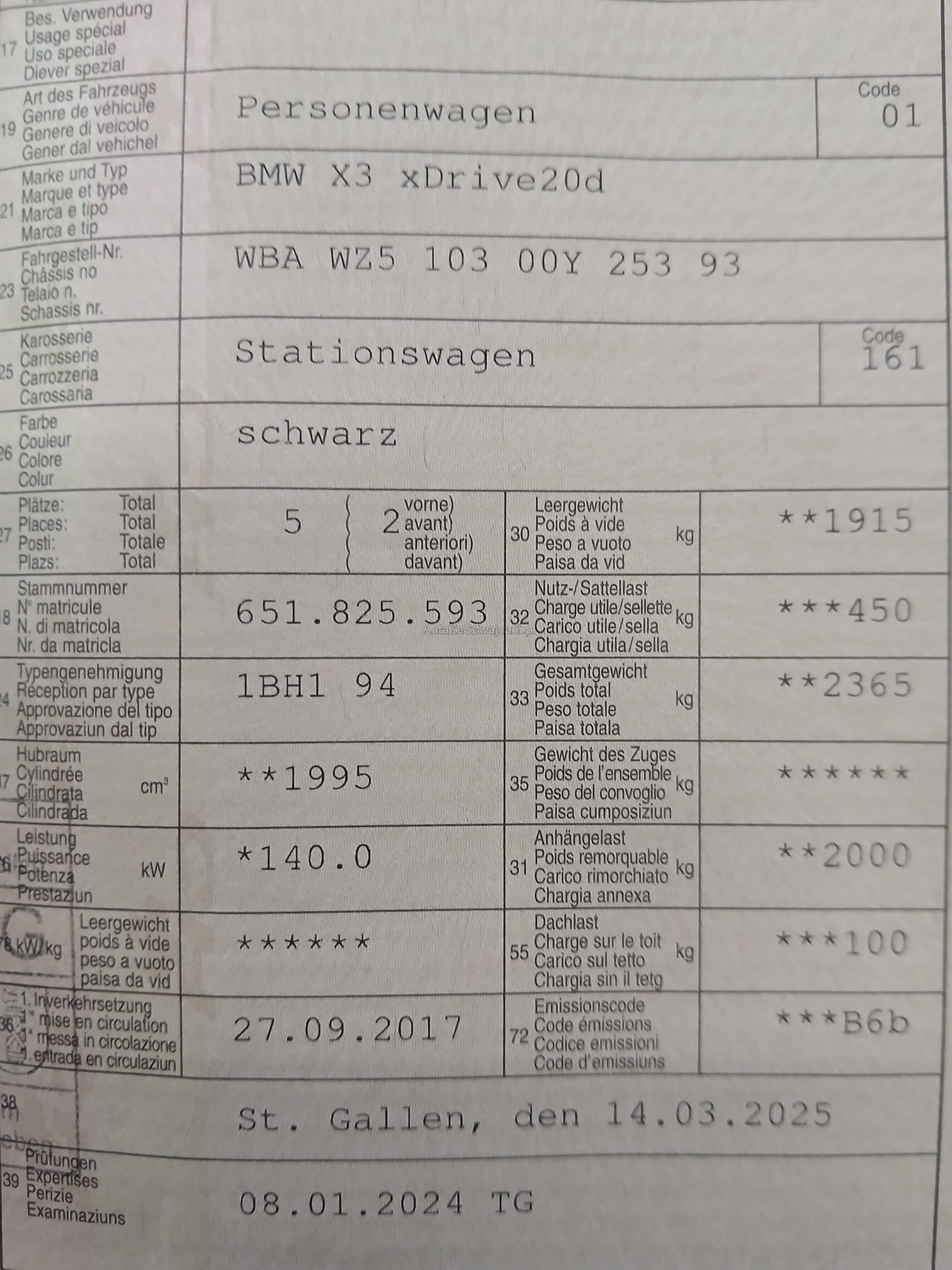 | Kommentar | Gepflegter BMW X3. Technisch nicht geprüft. Fahrzeug läuft einwandfrei ohne Mängel. Warnlampen leuchten keine. Service ist fällig. 8-Fach Bereift. Profil ist bei Sommer und Winter sicher noch für 1 Saison Fahrbar. 2 Schlüssel vorhanden. Dieselfilter erfolgreich getestet. Ist innen und aussen in einem guten Zustand. Leichte Gebrauchsspuren. Fahrzeug MUSS innert 7 Tage abgeholt werden. Banküberweisung. |