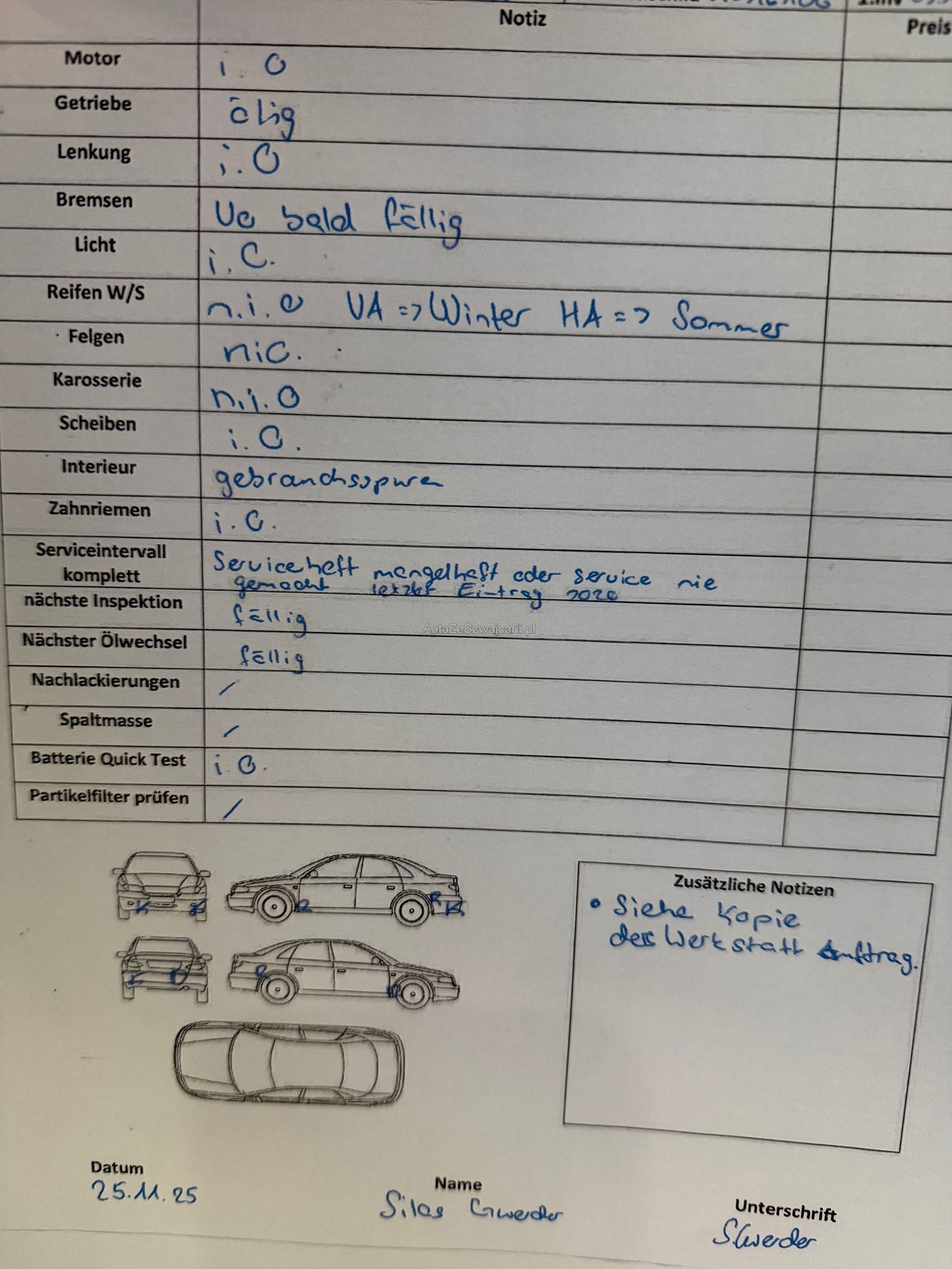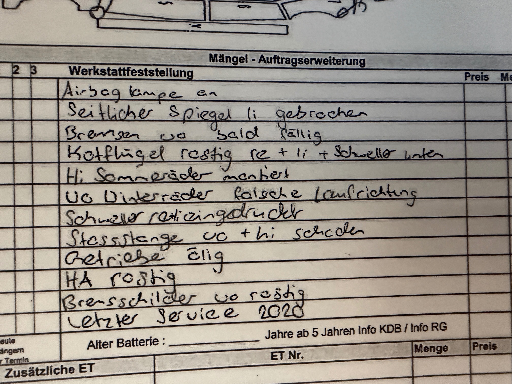 | Kommentar | Bewertung am FHZ wurde durchgeführt. Alle Mängel siehe Bilder und BU |