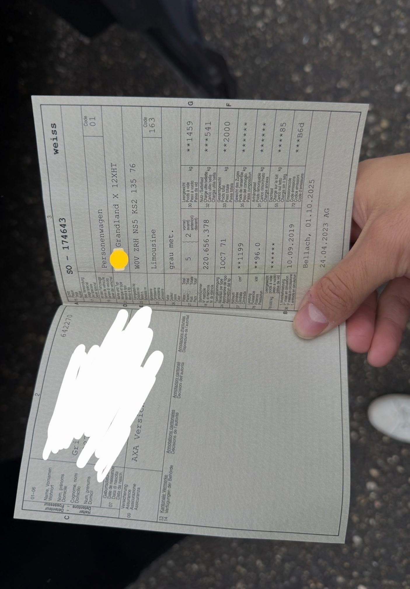 | Kommentar | Eintauschfahrzeug ohne technische Kontrolle. Schaden an Stosstange wird nächste Woche über Versicherung vom Kunden repariert. Frontscheibe hat kleinen Steinschlag. Fährt sich ohne Probleme - kleine Runde auf Platz gefahren. Wandelung / Minderung ausgeschlossen. Abholung innert 5 Arbeitstagen. |