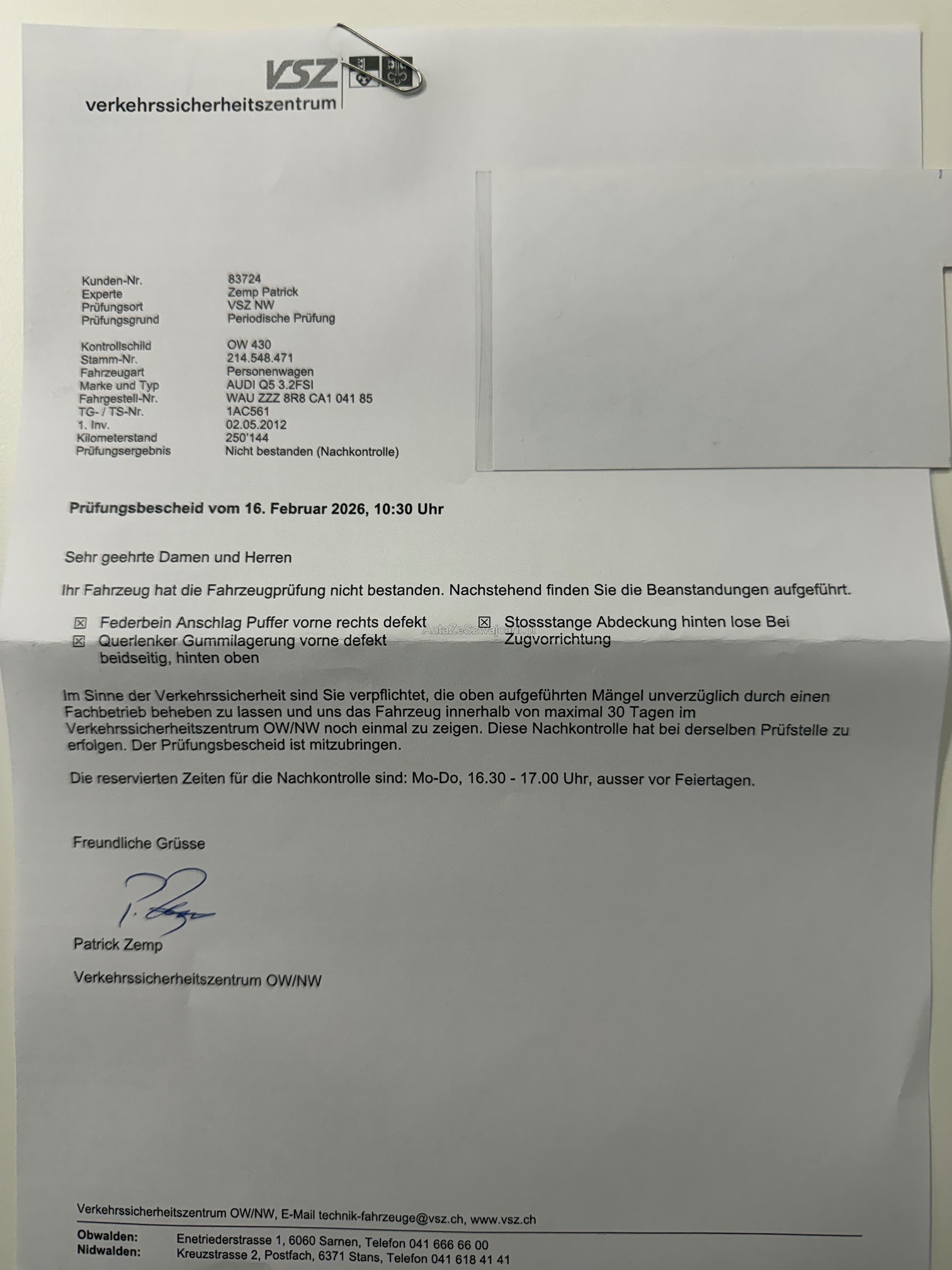 | Kommentar | Fahrzeug ab Platz ohne Garantie. Technische Mängel durch MFK festgestellt. (Foto) Ansonsten keine technische Prüfung gemacht. Ein Sommerpneu defekt. Kofferraumrollo fehlt. Jede Gewährleistung soweit nach Gesetz möglich wird wegbedungen, insbesondere Wandelung und Minderung. Fahrzeug muss nach 5 Arbeitstagen abgeholt werden. Standplatzgebühren 20.-/Tag |