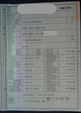| Condition_and_Equipment | Zustand Fahrzeug ist rollbar. Schlüssel Nur ein Schlüssel vorhanden. --- Rechts Tür vorne rechts ist eingedrückt. Front Front rechts eingedrückt. Kotflügel vorne rechts eingedrückt. Motorhaube eingedrückt. Frontblech/Maskenblech eingedrückt. Radhaus vorne rechts eingedrückt / gestaucht. Achse Aufhängungsteile vorne rechts beschädigt. Elektrik Kabelstränge verbrannt, beschädigt, abgerissen. Weitere Beschädigungen Stossfänger vorne, Scheinwerfer rechts, Parksensoren vorne, div, Fehlermeldungen im Armaturenbrett, Risko Kühler --- Serienaustattung Klimaanlage inkl. Mikrofilter Seitenairbag für Fahrer und Beifahrer Radio BMW Professional Sport-Lederlenkrad Reifendruck-Kontrollsystem RDC Durchladesystem Automatische Heckklappenbetätigung Regensensor Nebelscheinwerfer vorne Dynamische Stabilitäts-Control DSC Fahrer und Beifahrer-Airbag Velours-Fussmatten Uni-Lackierung Multifunktions-Lenkrad Fensterheber elektrisch vorne + hinten Kopfairbags vorne + hinten Kopfstützen im Fond klappbar Dieselpartikelfilter Kindersitzbefestigung Isofix für Fondsitze Digital audio DAB-Tuner ABS Antiblockiersystem inklusive Bremsassistent Interieurleisten Satinsilber matt Auto Start Stopp Funktion Freisprecheinrichtung mit USB-Schnittstelle Keine Gewähr auf die Angaben der Serienausstattungen Leichtmetallräder V-Speiche 395 BMW Service Plus 10 Jahre/ 100'000 km Sonderausstattung Lordosenstütze für Fahrer und Beifahrer Elektrische Sitzverstellung mit Memory Sitzheizung für Fahrer und Beifahrer Innen- und Aussenspiegel automatisch abblendbar Sonnenschutzverglasung Metallic-Lackierung Navigationssystem Professional Komfortzugang Panorama-Glasdach Park Distance Control PDC vorn und hinten Head-Up Display Fernlichtassistent Rückfahrkamera Aktive Geschwindigkeitsregelung mit Stop&Go Funktion Spurwechselwarnung Adaptives M Fahrwerk Harman/Kardon Surround Sound System Speed Limit Info Surround View Kameras Dachreling schwarz Sportlenkung variabel Instrumentenkombination/ erweitert Adaptive LED-Scheinwerfer M Leichtmetallräder Sternspeiche 403/ Mischbereifung Komforttelefonie mit erweiterter Smartphone Anbindung ConnectedDrive Services Real Time Traffic Information Remote Services Driving Assistant |