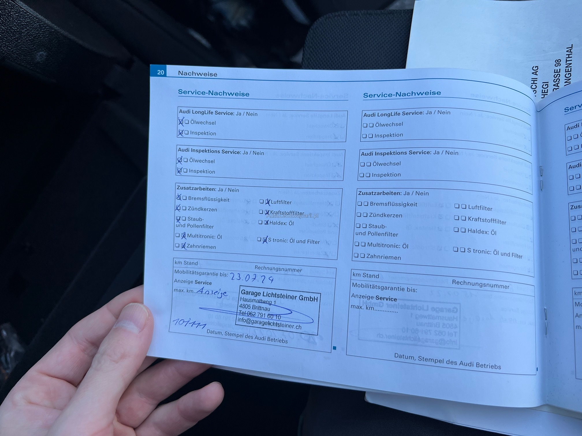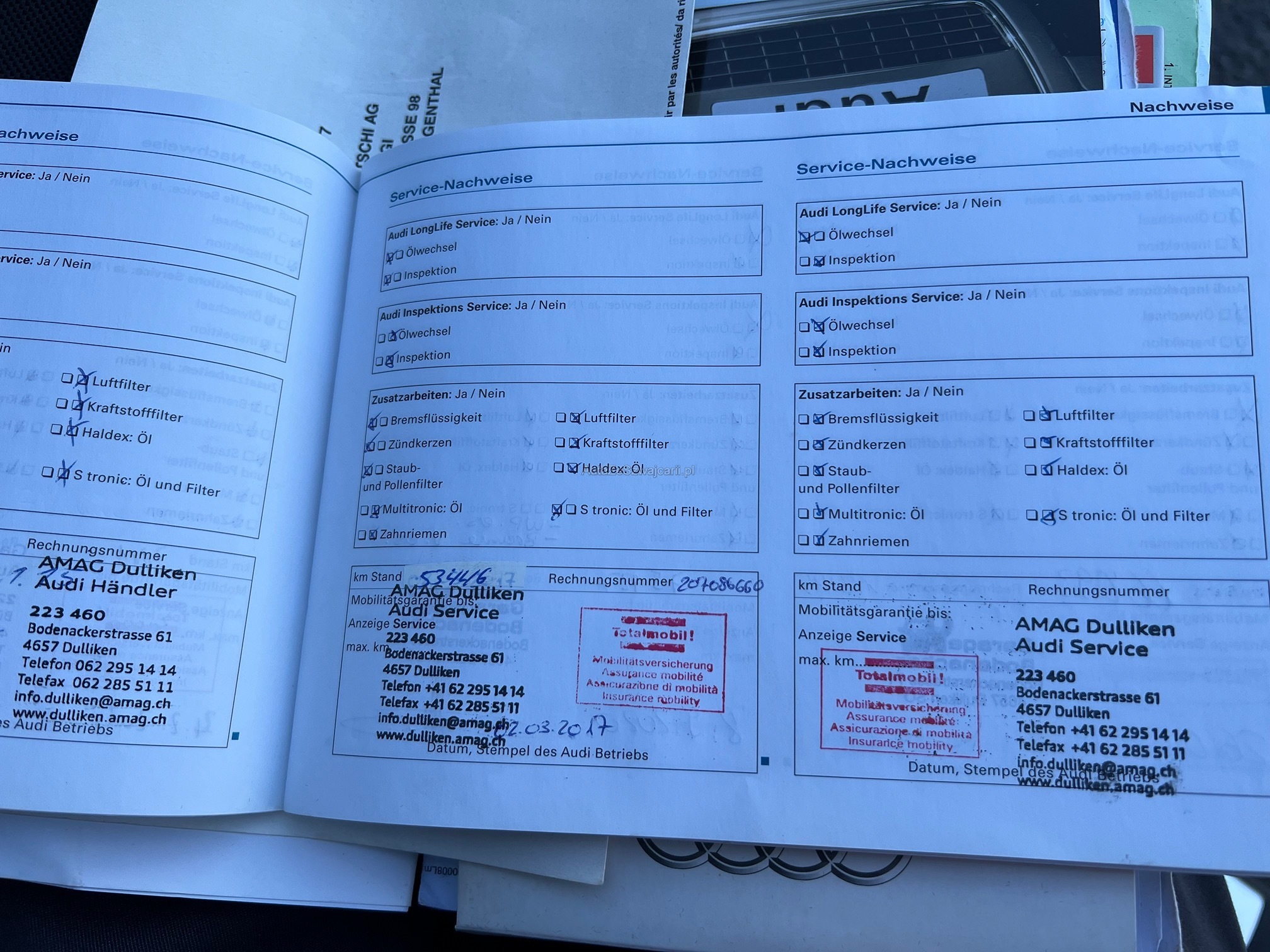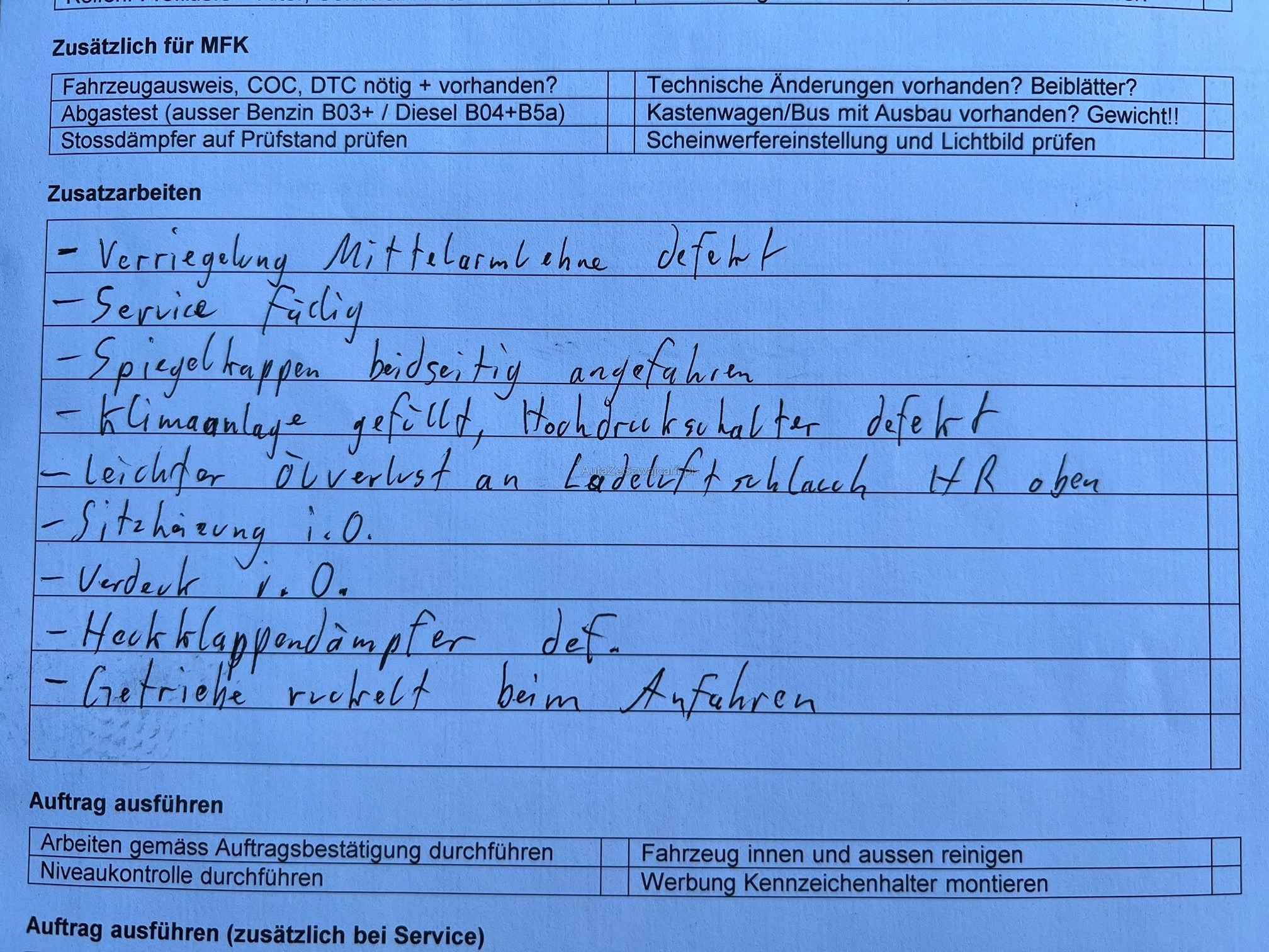 | Kommentar | - Es wurde ein vollständiger Werkstatttest durchgeführt - Probefahrt i.O. (Motor und Fahrwerk) - Probefahrt Getriebe = ruckelt beim Anfahren, ansonsten bei Fahrt i.O. - Carrosserieschäden gemäss Bilder - Frontscheibe hat kleine Steinschläge jedoch OHNE Rissbildung - Service fällig - Verriegelung Mittelarmlehne defekt - Spiegelkappen Aussenspeigel beidseitig angefahren - Klimaanlage gefüllt, jedoch Hochdruckschalter defekt - Leichter Ölverlust an Ladeluftschlauch HR oben, kann gereinigt werden für MFK - Heckklappendämpfer schwach, jedoch noch funktionstüchtig |