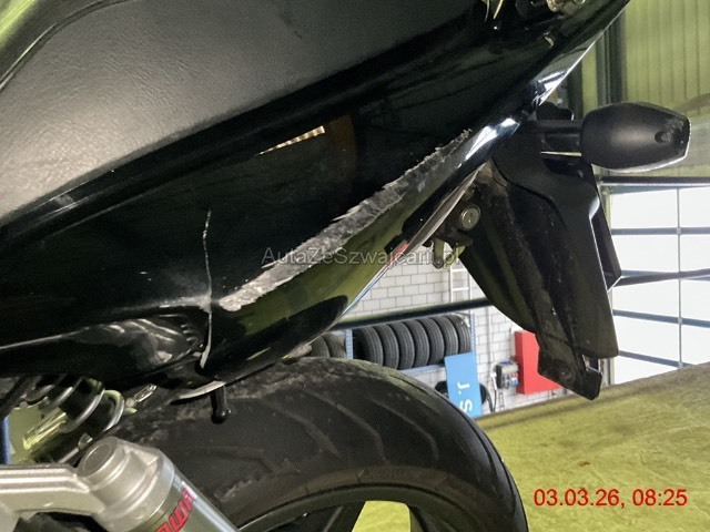 | Schadensbeschreibung | Beschreibung der Schäden: Tank, Scheinwerfer, Lenker, Gabel, Blinker VR und HL , Rückspiegel, Motordeckel Getriebe, Kühler, Kupplungshebel, Sozius Fussrasten rechts, Schwinge leichte Kratzer oberflächlich, Abdeckung hinten links, beschädigt. Motor wurde nicht gestartet um nicht weitere Folgeschäden zu generieren. Zündschloss klemmt ein wenig. Vorbestandene Schäden: |