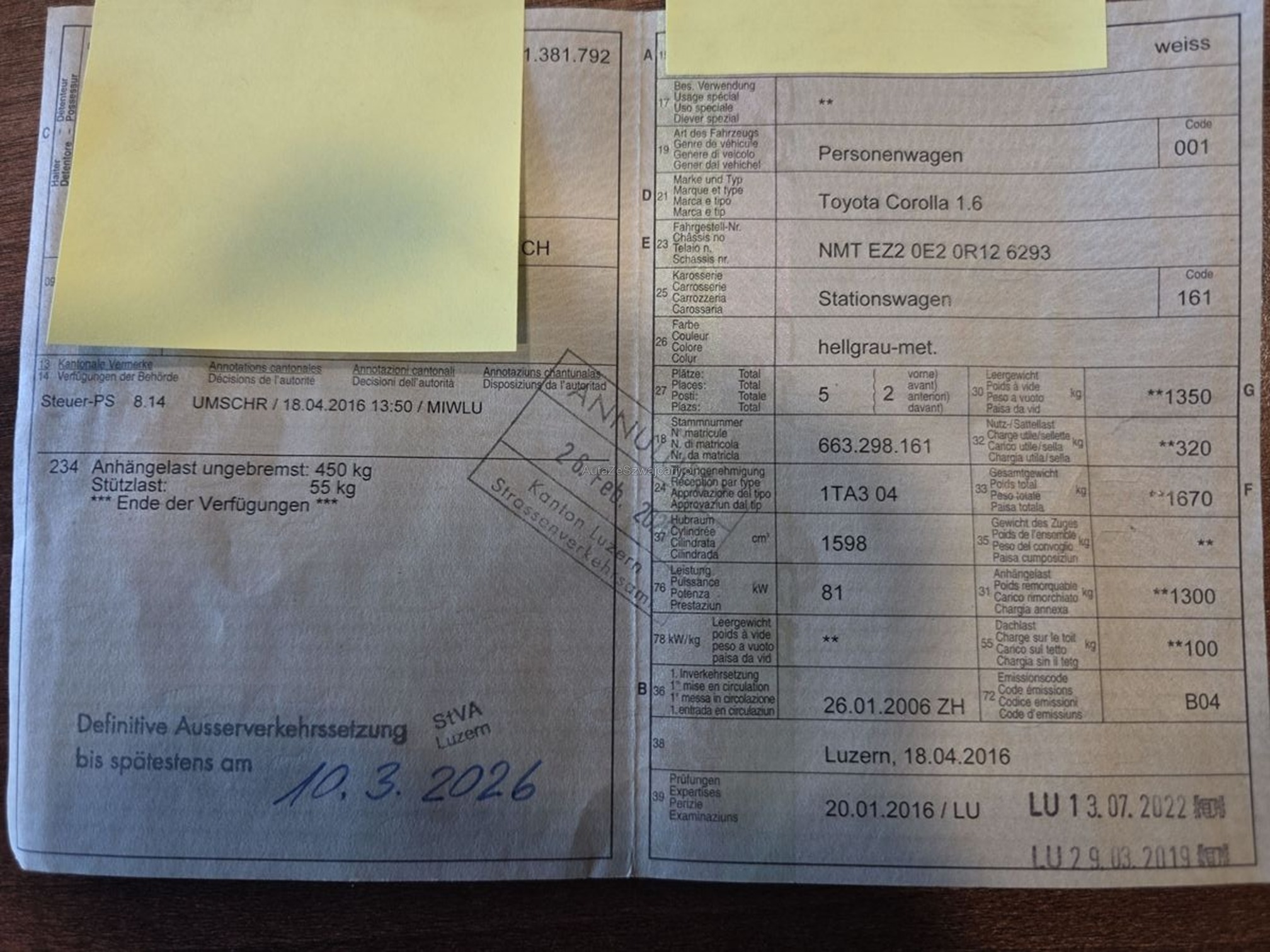 | Kommentar | Fahrzeug mit neuen Bremsen vorne und vier neuen Winterreifen vorne. Diverse Gebrauchsspuren. Am Fahrzeug wurde kein Werkstatttest gemacht (Für sichtbare oder nicht sichtbare Mängel wird nicht gehaftet). Wir testen & kontrollieren nicht alle Funktionen vom Fahrzeug. Das Risiko liegt somit vollumfänglich beim Käufer. Nachdem der Höchstbietende den Zuschlag erhalten hat, gibt es keine Nachverhandlung, auch wenn nicht deklarierte Mängel zum Vorschein kommen sollten. Ab Platz ohne Garantie, Wandelung und Minderung werden wegbedungen. Das Fahrzeug muss nach dem Zuschlag innert 5 Tagen abgeholt werden. |