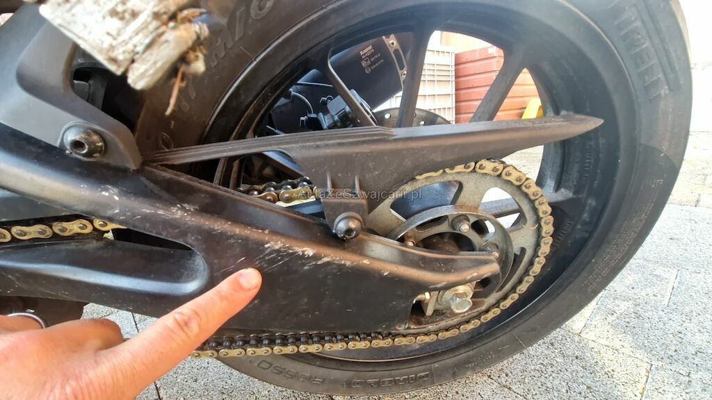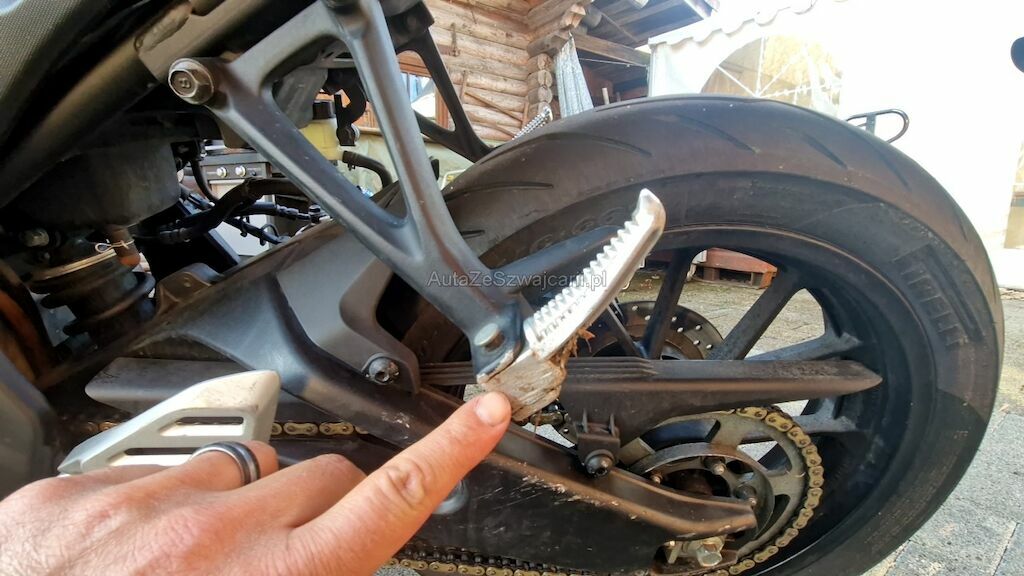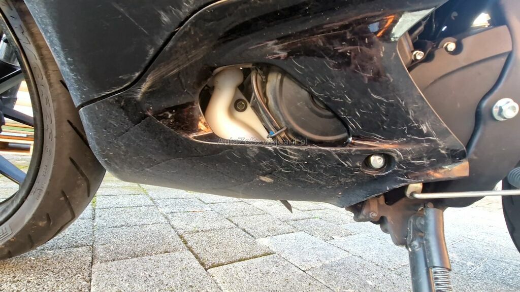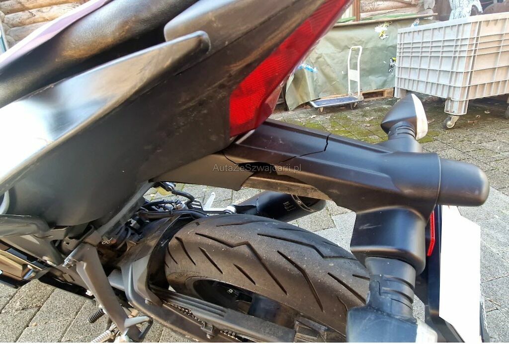 Heckverschalung zerkratzt, Seitenschale vorne oben und unten zerkratzt, Fussraster VL + HL zerkratzt + verbogen, Schwinger HL zerkratzt, Schalthebel verbogen, Seitenständer, Spiegel links, Lenker VL, Lenkergewicht VL, Kupplungshebel, Lenkeranschlag VL, Heckleuchten- + Nummerträger gebrochen