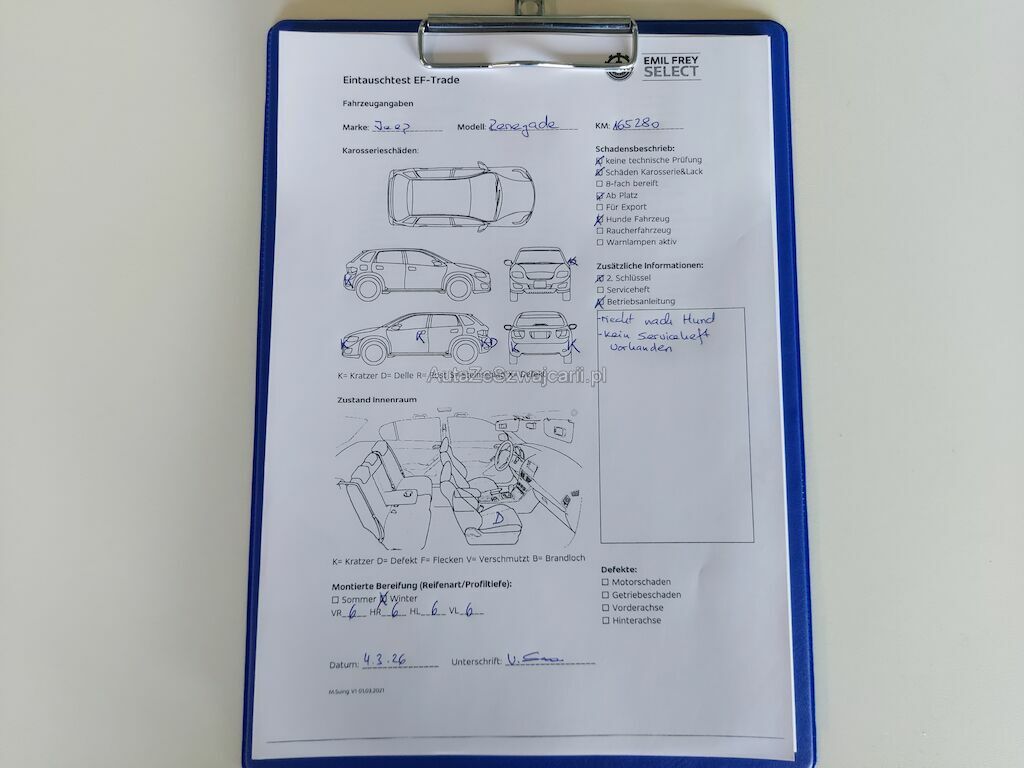 | Information | Keine technische Prüfung (Werkstatttest) vorgenommen Diverse Schäden an Karosserie/Lack. Fahrzeug ab Platz, ohne Garantie und Aufbereitung. Fahrzeug ist für Export DPF/FAP Filter nicht kontrolliert Es handelt sich um ein Hunde-Fahrzeug. Fahrzeug riecht stark nach Hund. Ist voll Hundehaare |