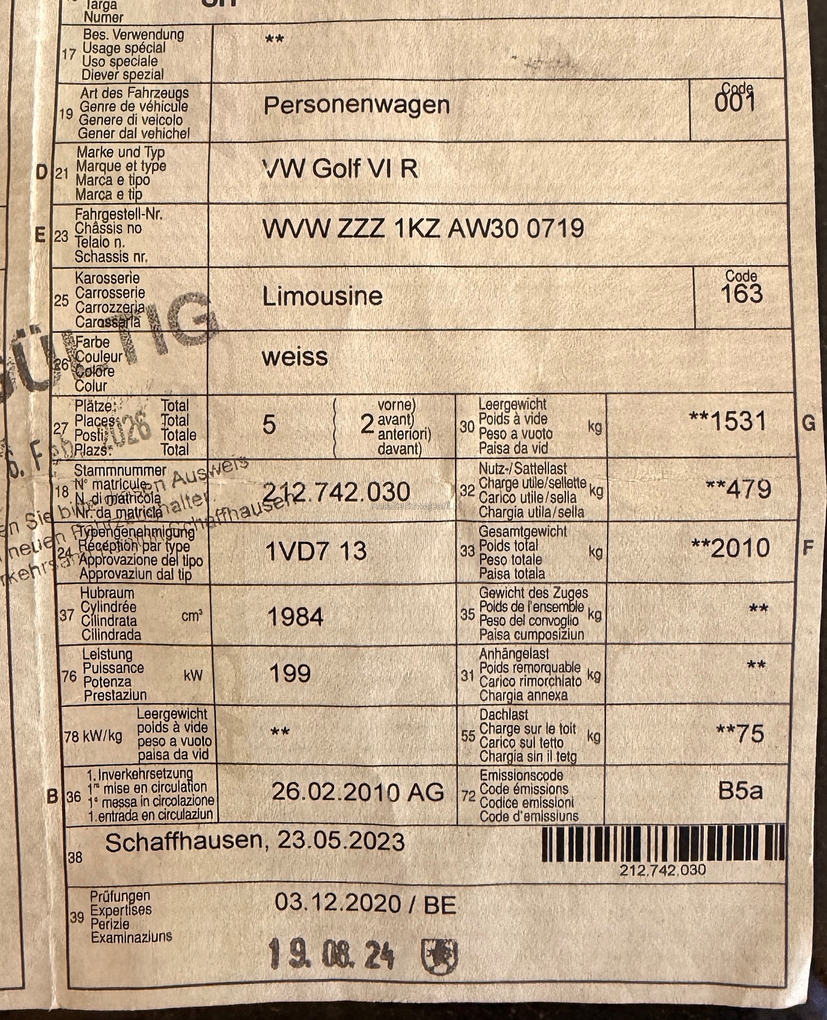 | Kommentar | Fahrzeug hat Steinschlag an der Frontscheibe. Am Fahrzeug wurde kein Werkstatttest gemacht (Für sichtbare oder nicht sichtbare Mängel wird nicht gehaftet). Wir testen & kontrollieren nicht alle Funktionen vom Fahrzeug. Das Risiko liegt somit vollumfänglich beim Käufer. Nachdem der Höchstbietende den Zuschlag erhalten hat, gibt es keine Nachverhandlung, auch wenn nicht deklarierte Mängel zum Vorschein kommen sollten. Ab Platz ohne Garantie, Wandelung und Minderung werden wegbedungen. Abholung nach Zuschlag innert 5 Tagen. |