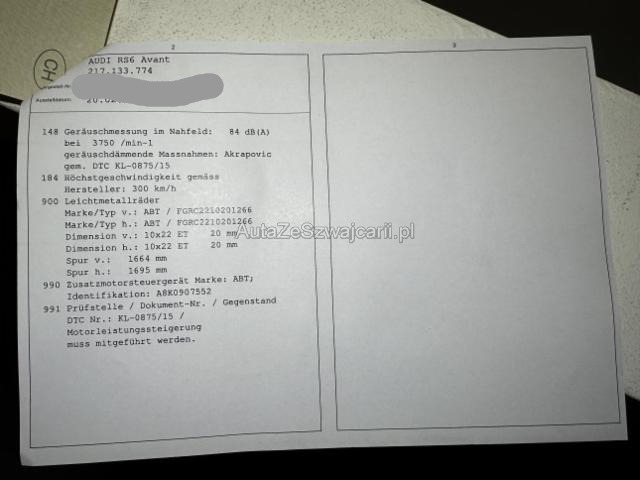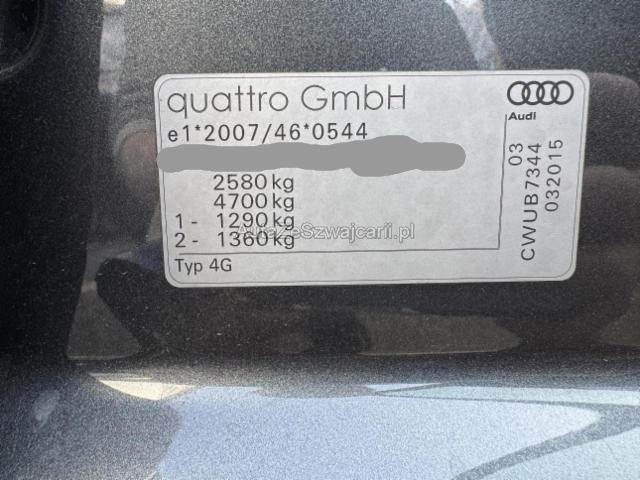 | Condition_and_Equipment | Zustand Fahrzeug ist rollbar. Bereifung Fahrzeug wird mit Winterräder abgegeben. Schlüssel Nur ein Schlüssel vorhanden. --- Front Front eingedrückt. Kotflügel vorne rechts eingedrückt. Motorhaube eingedrückt. Radhaus vorne links eingedrückt / gestaucht. Motor Alle Kühler vorne sind eingedrückt. Achse Risiko Vorderachse. Risiko Lenkung. Innenraum Starke Verschmutzung im Innenraum. Sonstige Schäden Div.Carrosserie Teile sind leicht beschädigt. Weitere Beschädigungen Glassplitter über das Ganze Fahrzeug verteilt, Risiko Lackbeschädigungen --- Serienaustattung Sitzheizung für Vordersitze Lendenwirbelstützen elektr. für Vordersitze Mittelarmlehne vorne Tempostat Airbag Fahrer und Beifahrerseite Seitenairbag Fahrer und Beifahrerseite Servotronic Seitliches Kopfairbagsystem SIDEGUARD Radschrauben mit Diebstahlsicherung Dachhimmel schwarz/ Stoff Elektrische Fensterheber vorne + hinten Reifendruck-Kontrollsystem RDK Dekoreinlagen in Carbon Metallic-/ Perleffekt-Lackierung Scheinwerfer Reinigungsanlage ABS und EBV Elektr. Bremskraftverteilung Bremsassistent EBA ESP Elektronisches Stabilitätsprogramm ASR und EDS Antriebsschlupfregelung und Differrentialsperre Rücksitzlehne geteilt 1/3 oder 2/3 / umklappbar Lenksäule Neigungs- und Axialverstellung elektrisch Automatisch abblendbarer Innenspiegel Adaptive air suspension Radioempfang digital DAB Elektromechanische Parkbremse Klimaautomat Vier-Zonen Ablagepaket Tire mobility system Dachreling Alu Bose Sound System Diebstahlwarnanlage/ Innenenraum-Überw./ Abschleppschutz Vordersitze elektrisch verstellbar/ Fahrersitz mit Memory Licht- und Regensensor S Sportsitze Pack Leder Tiptronic Multif.-Sportlenkrad 3-Sp. Leder (unt. abgeflacht) Gepäckraumklappe elektrisch öffnend und schliessend MMI Navigation plus LED-Scheinwerfer Audi hold assist Fahrerinformationssys. mit Farbdisplay + Effizienzprogramm Ambientebeleuchtung Audi pre sense basic Audi Parking System plus Leichtmetallräder 20" 7-Doppelspeichen Aussensp. el.verstellbar/heizbar/abblendbar/ ankl./Memory Stop + Start System Keine Gewähr auf die Angaben der Serienausstattungen Alcantara-Leder mit Rautensteppung Audi Phone Box und Audi connect Sonderausstattung Durchladesystem inkl. Skisack Schienensystem im Gepäckraum Dekoreinlagen in Aluminium gebürstet matt Pack Alu-Optik matt Pack Assistenz inkl. Audi pre sense plus Tempolimitanzeige Head-Up Display Sonderlackierung Kristalleffekt Parkassistent 4 Kameras Bird's eye view Panorama-Glasdach elektrisch Leichtmetallräder 21" 5-Doppelspeichen schwarz glanz |