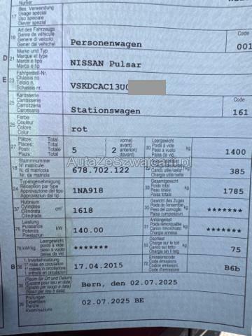 | Condition_and_Equipment | Demontage Persönliche Gegenstände oder Ladegut im Fahrzeug werden entfernt. Zustand Fahrzeug muss transportiert werden (Höhe und Breite beachten). Bereifung Fahrzeug wird mit Winterräder abgegeben. --- Front Front eingedrückt. Heck Heck eingedrückt. Sonstige Schäden Div.Carrosserie Teile sind leicht beschädigt. Hagel Hagelschaden schwer. --- Serienaustattung Airbag Fahrer und Beifahrerseite Sitzheizung vorne Aussenspiegel elektrisch verstellbar ESP Elektronisches Stabilitätsprogramm Nebelscheinwerfer Lederlenkrad Mittelarmlehne hinten Innenspiegel automatisch abblendbar Kopfairbag vorne und hinten Leichtmetallfelgen 16" Intelligent Key-System Zwei Zonen-Klimaautomatik Seitenairbags vorne Tempomat mit Geschwindigkeitsbegrenzer ABS/ EBD Regensensor für Frontwischer Isofix-Kindersitzbefestigung hinten Bluetooth Interface/ Schnittstelle Reifen-Reparatur Set Aussenspiegel beheizbar Stop + Start System Keine Gewähr auf die Angaben der Serienausstattungen Radio/ CD mit AUX und USB Notbrems-Assistent Sonderausstattung Perleffekt-Lackierung Navigation Nissan Connect |