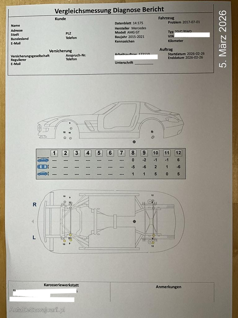 | Schadensbeschreibung | Beschreibung der Schäden: Das Fahrzeug ist mit der rechten Seite mit einem Trottoir kollidiert. Dabei wurden Reifen Felgen Radaufhängung Lenkung der rechten Seite beschädigt. Gemäss beiliegenden Dokumenten kann erkannt werden, dass die Aufhängungpunkte der Radaufhängung leicht verschoben sind. Im Innenraum wurden die diversen Steuergeräte zur Unfallanalyse ausgebaut, diese sollten jedoch bis auf das Airbag Steuergerät vorhanden sein. |
