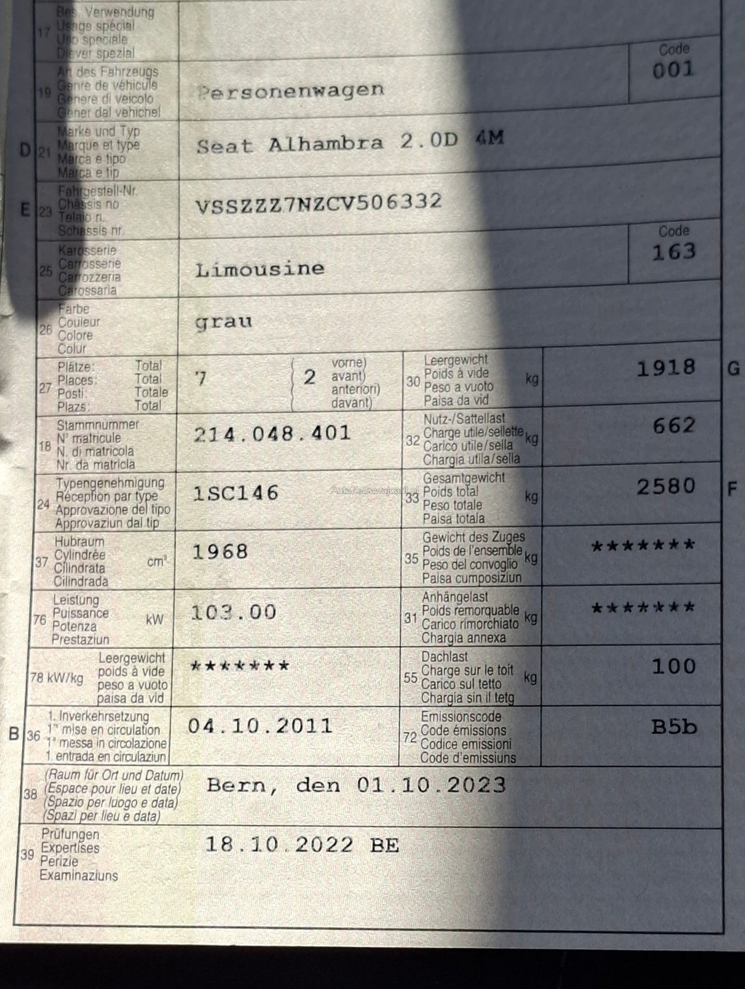 | Kommentar | Der Alhambra hat diverse Gebrauchsspuren Innen und Aussen Cd-Player ohne Funktion und Fehler in den Parksensoren Rostansätze an der Carrosserie Keine technische Prüfung gemacht Keine Nachverhandlung nach Gebotsbestätigung pro Standtag werden gebühren von 20.- fällig |