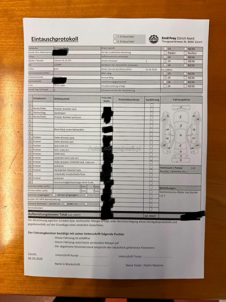 | Information | Keine technische Prüfung (Werkstatttest) vorgenommen Diverse Schäden an Karosserie/Lack. Fahrzeug ab Platz, ohne Garantie und Aufbereitung. DPF/FAP Filter nicht kontrolliert Keine Gewähr auf die Angaben der Sonder- und Serienausstattung / keine mechanische Prüfung. Fahrzeug wurde unzerlegt expertisiert / keine Haftung für allfällige, nach Demontage bekanntwerdenden Mängel. Fahrzeugbereifung und Ausstattung gemäss Fotos / Fahrzeugkauf auf eigenes Risiko ab Platz ohne Nachwährschaft. - Letzter Service wurde 01.06.2018 bei 108931km gemacht. - Geschwindigkeitsanzeige ohne funktion - Motorhaube: Beule/ Delle - Frontscheibe: Steinschlag, Spotrepair - Dach: Beule/ Delle - Heck: Rost innen - Seitenschweller VL: Beule/ Delle - Türe VL: Delle drücken, Polierne - Türe HL: Delle drücken, Poilieren - Seitenschweller HL: Kratzer - Seitenschweller VR: Delle - Türe VR: Lackieren - Hüre HR: Delle/ Lackieren - Seitenschweller HR: Lackieren - Felge VL: Kratzer - Felge VR: Kratzer |
