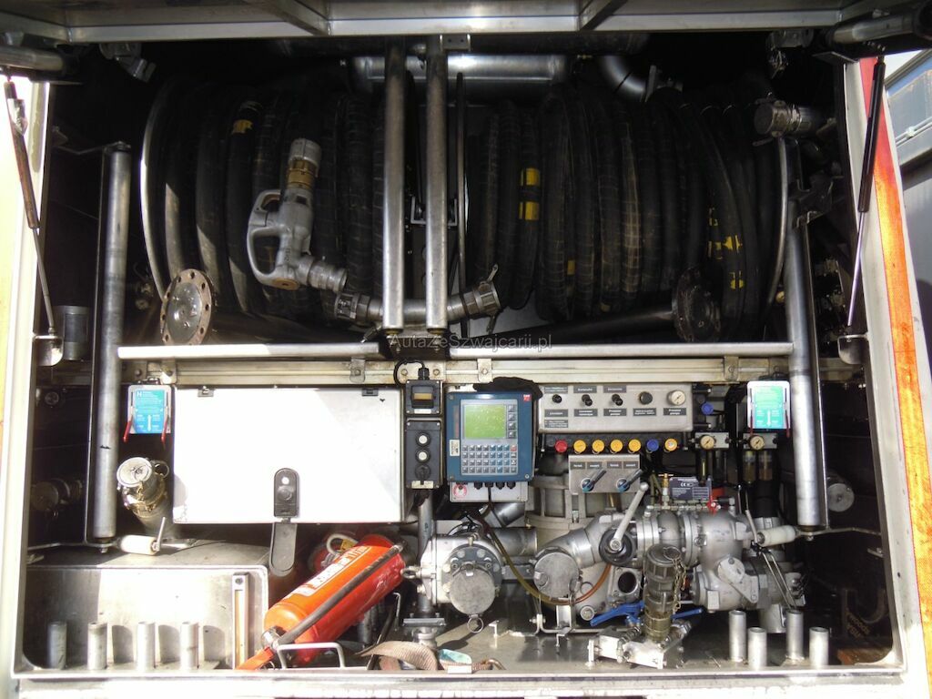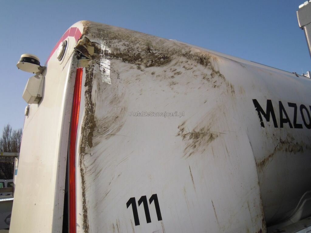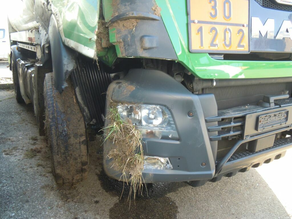 Dommages flanc droit: Cabine fortement déformée, pare-brise, vitres latérales, capot, pare-chocs, phares. rétroviseurs, marche-pied, aile, élargisseur aile, coquilles ailes et éléments intérieurs de cabine cassés, réservoir, tôles latérales, pare-chaleur échappement enfoncés, portillon caisse rangement arrière arraché, citerne déformée et tôle déchirée, porte arrière de fermeture citerne déformée.
