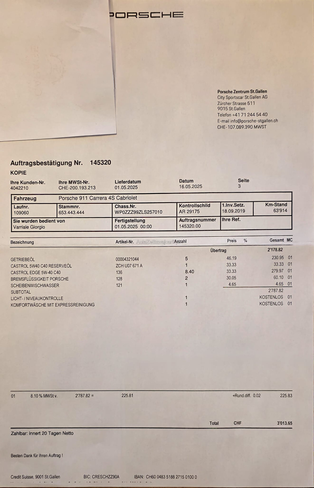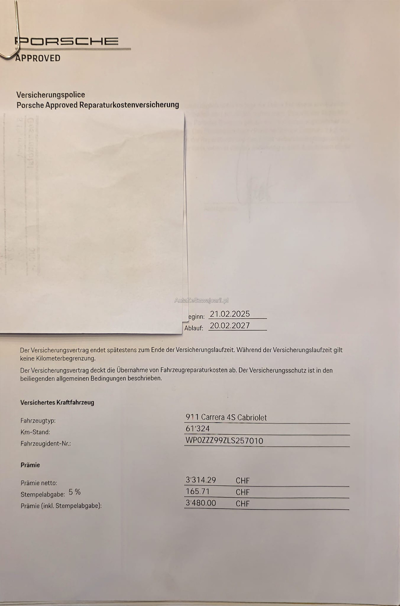 | Kommentar | Ein wunderschön gepflegtes Fahrzeug, wie auf den Bildern ersichtlich, in technisch einwandfreiem Zustand. Besichtigungen sind nach vorheriger Terminvereinbarung jederzeit möglich. Sommerräder sollten demnächst erneuert werden. Die Karosserie weist keine grösseren Abnützungen auf. Lediglich kleinere Steinschläge an der Motorhaube und an der Seite sind vorhanden (siehe Bilder). Der grosse Service wurde im Mai 2025 durchgeführt (Rechnung vorhanden). Porsche Approved Garantie bis Februar 2027 – diese kann selbstverständlich in den folgenden Jahren verlängert werden. Sonderausstattung Adaptive Sportsitze inkl. Komfort-Memory-Paket Interieur in Leder Sport Chrono Paket Garagentoröffner HomeLink Komfortzugang Aussenspiegel elektrisch anklappbar Windschutzscheibe mit Graukeil Leichtmetallräder 20"/21" Carrera Classic Winter-Leichtmetallräder in Matt-Schwarz (siehe Bilder) Servolenkung Plus Hinterachslenkung Spurwechselassistent Spurhalteassistent inkl. Verkehrszeichenerkennung Abstandsregeltempomat Park-Distanz-Sensoren vorne und hinten Rückfahrkamera und 360° Surround View Matrix LED-Scheinwerfer Beheizbares GT-Sportlenkrad Vordersitze belüftet Sitzheizung vorne Porsche Wappen auf den Kopfstützen DAB+ Digital Audio Bose Surround Sound System Der Verkauf wird direkt mit dem Kunden abgewickelt. Das Fahrzeug wird mit Porsche Approved Garantie verkauft. Wandelung und Minderung werden jedoch vertraglich ausgeschlossen. |