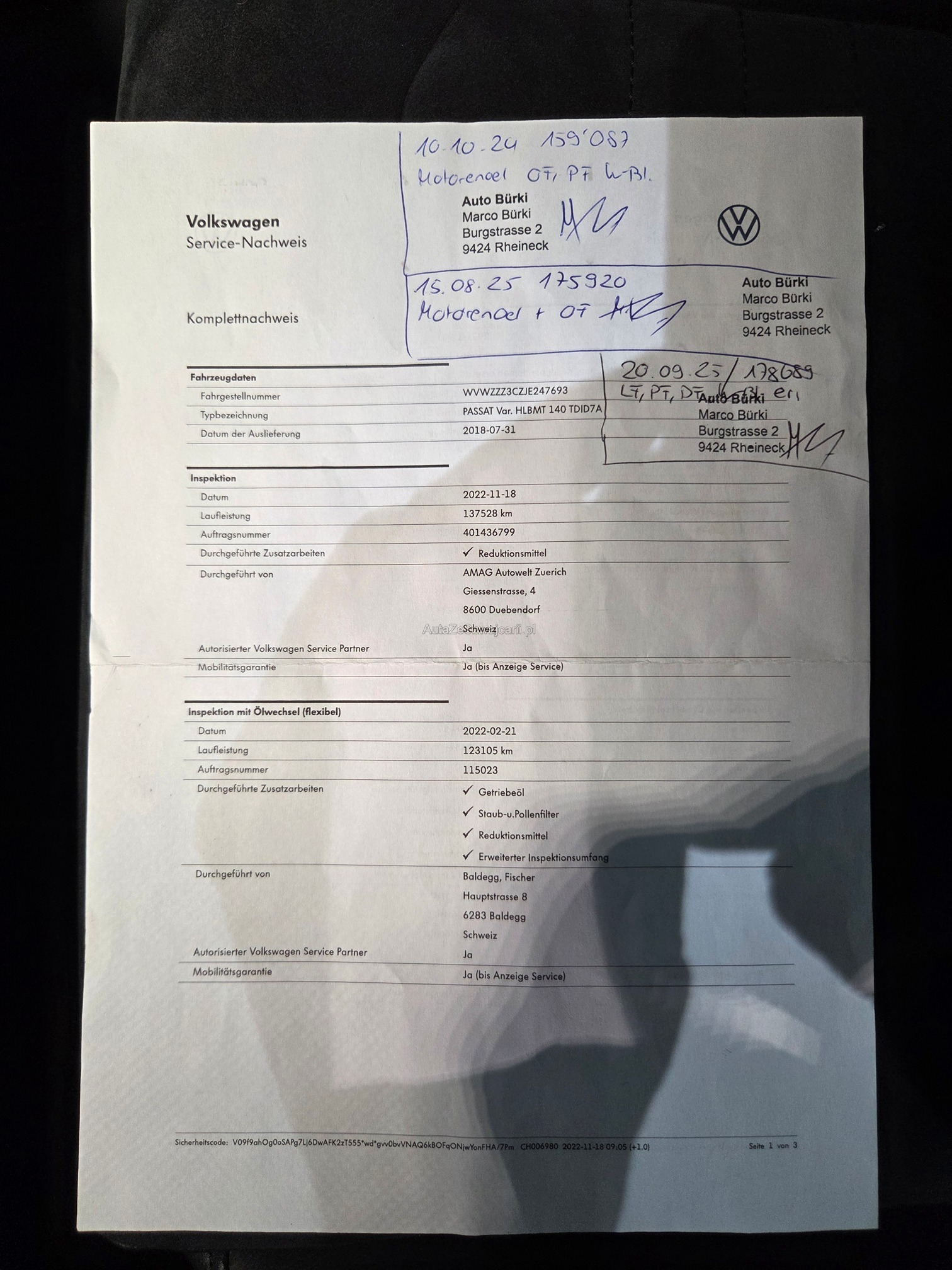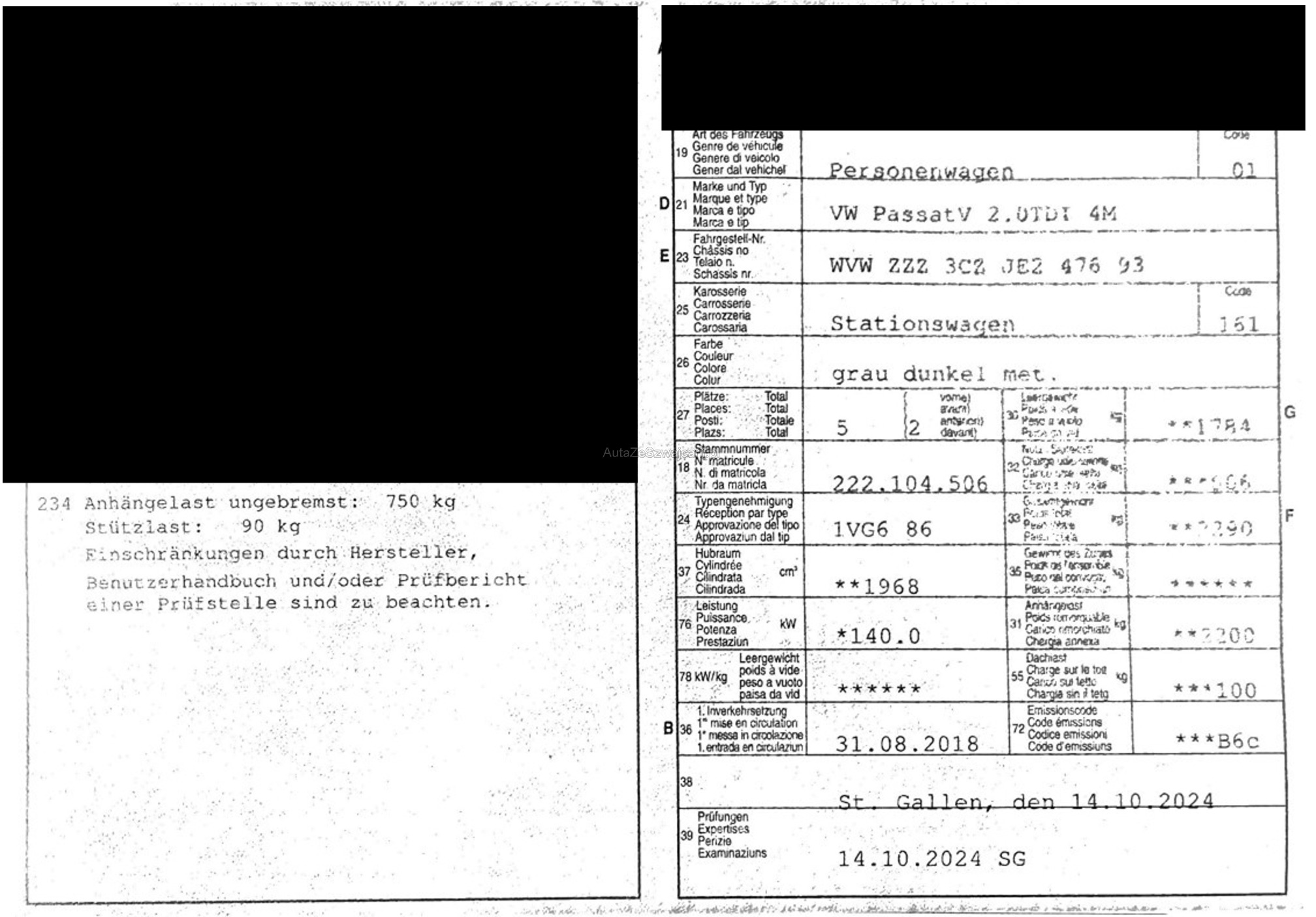 | Kommentar | Am Fahrzeug wurde keine genaue technische Prüfung durchgeführt! - wunderschöner VW Passat Variant 4-Motion in Highline Ausführung - DPF-Test bestanden, siehe Foto von Ausdruck - 8-fach befelgt mit Originalen VW-Rädern (Profiltiefe Winterreifen 7-8mm, Profiltiefe Sommerräder 4.5-5.5mm) - schwenkbare AHK mit 2200kg Anhängelast - Innenraum top gepflegt - Servicegepflegt - kaum Karrosseriebeschädigungen (siehe Fotos) Am Fahrzeug wurde kein Werkstatttest durchgeführt. Für sichtbare oder nicht sichtbare Mängel wird keine Haftung übernommen. Wir prüfen und kontrollieren nicht alle Funktionen des Fahrzeugs. Das Risiko liegt vollständig beim Käufer. Nach Zuschlag an den Höchstbietenden sind Nachverhandlungen ausgeschlossen, auch wenn nicht deklarierte Mängel auftreten. |