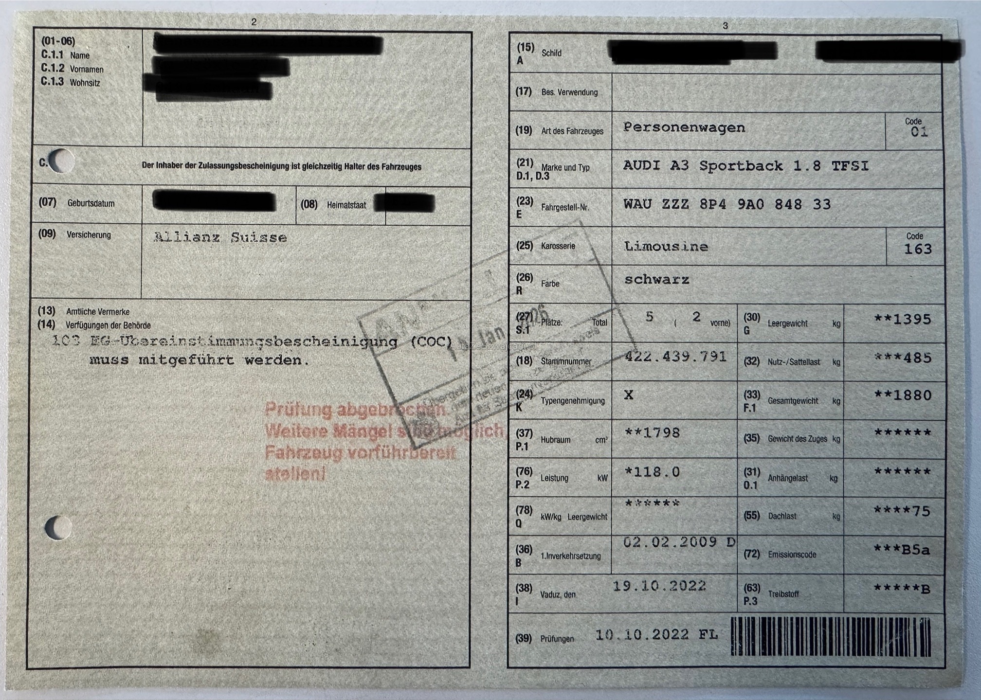 | Kommentar | Das Fahrzeug wurde nicht durch unsere Werkstatt geprüft. Das Fahrzeug befindet sich im MFK Prüfprozess, dieser wurde abgebrochen (siehe Fahrzeugausweis), die Mängelliste ist jedoch nicht vorhanden. Jede Gewährleistung, soweit nach Gesetz möglich, wird wegbedungen, insbesondere sind Wandelung und Minderung ausgeschlossen. |