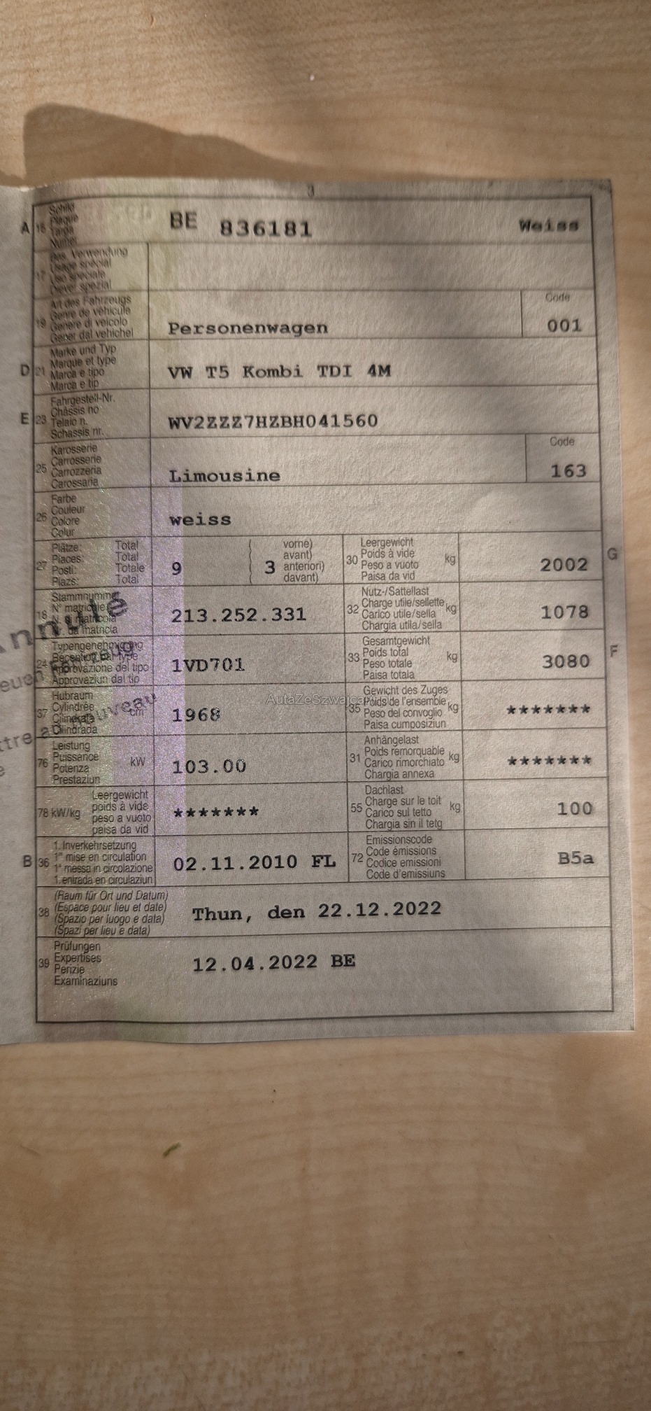 | Kommentar | VW T5 Lang 4Motion Fährzeug fährt, bremst und schaltet einwandfrei. Beulen und Kratzer vorhanden, auch Hagel ist vorhanden. Lenkstange hat Spiel, sonst wurden keine technischen Prüfungen durchgeführt. Am Fahrzeug wurde keine vollumfängliche Prüfung der mechanischen Teile und der Carrosserie durchgeführt! Das Risiko liegt somit vollumfänglich beim Käufer. Um Missverständnisse zu vermeiden kann das Fahrzeug auf Voranmeldung besichtigt & getestet werden. Wird davon bewusst kein Gebrauch gemacht, liegt die Verantwortung beim Käufer. Nach Zuschlag, keine Nachverhandlungen möglich. Ab Platz ohne Garantie, Wandelung und Minderung werden wegbedungen. |