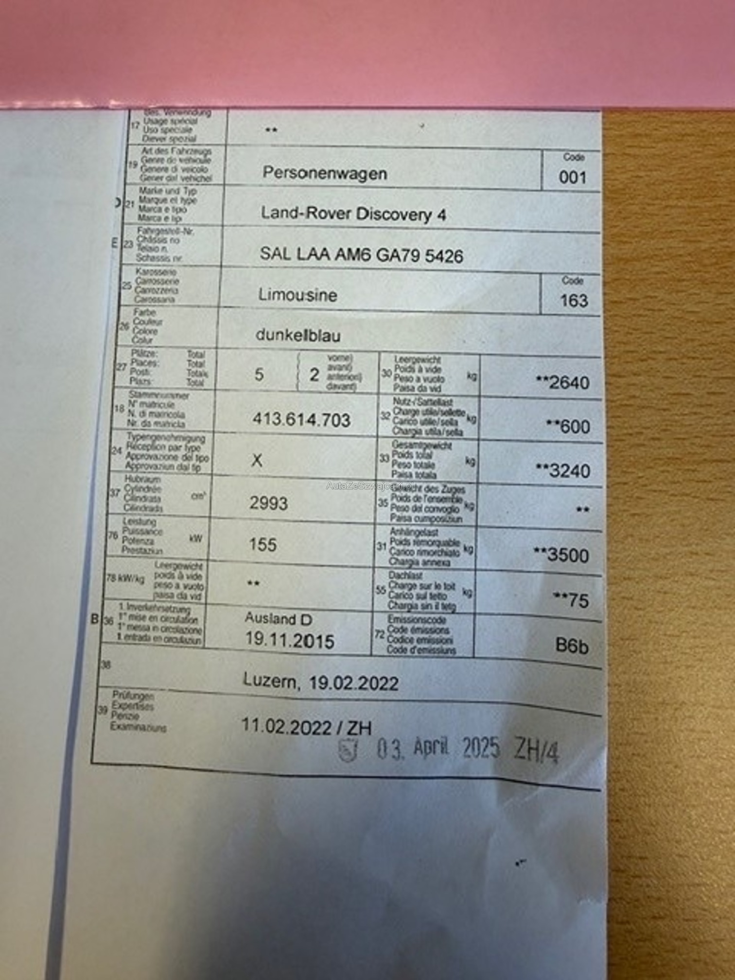 | Kommentar | FZ wurde technisch nicht geprüft. Gemäss Aussage vom Kunde, Fahrzeug braucht viel Öl. Mit Anhängerkupplung. |
