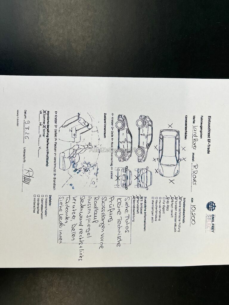 Keine Technische Prüfung, Stosssstangen vorne, Radlauf, beide Außenspiegel, Seitenwand rechts und links, Kratzer kleine Dellen, Türkanten, siehe Leder Türe siehe Fotos.