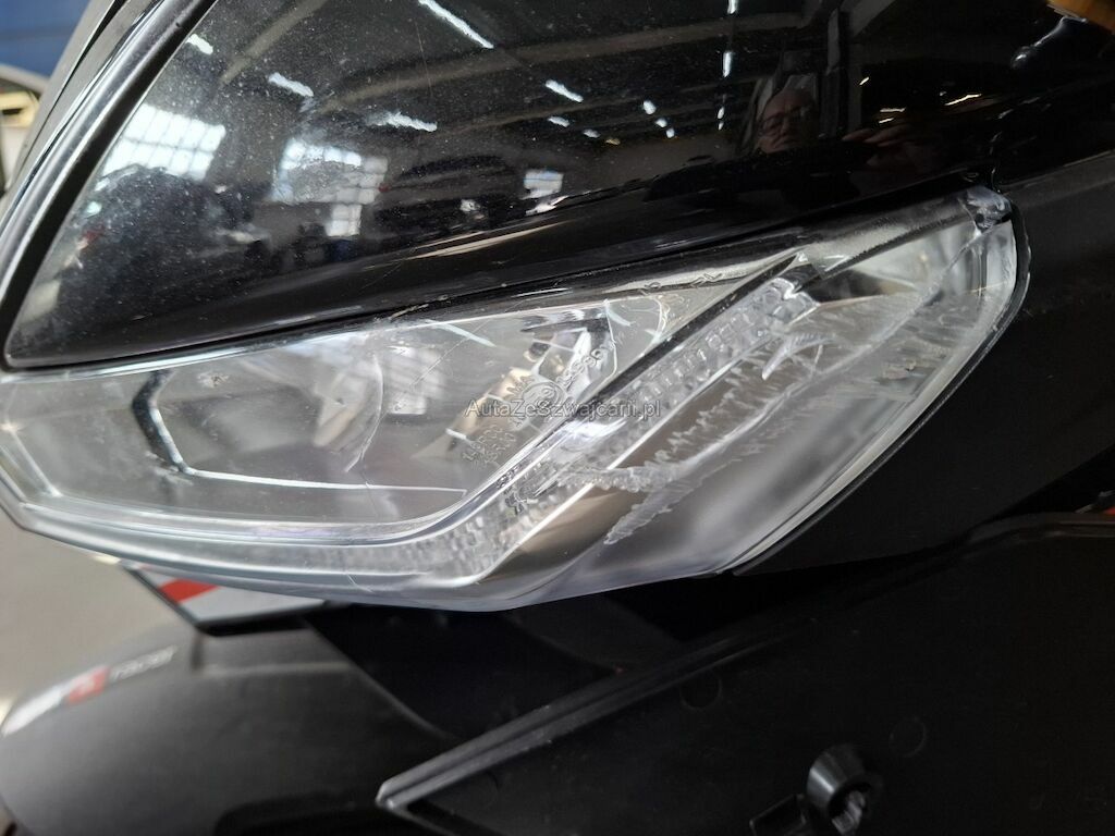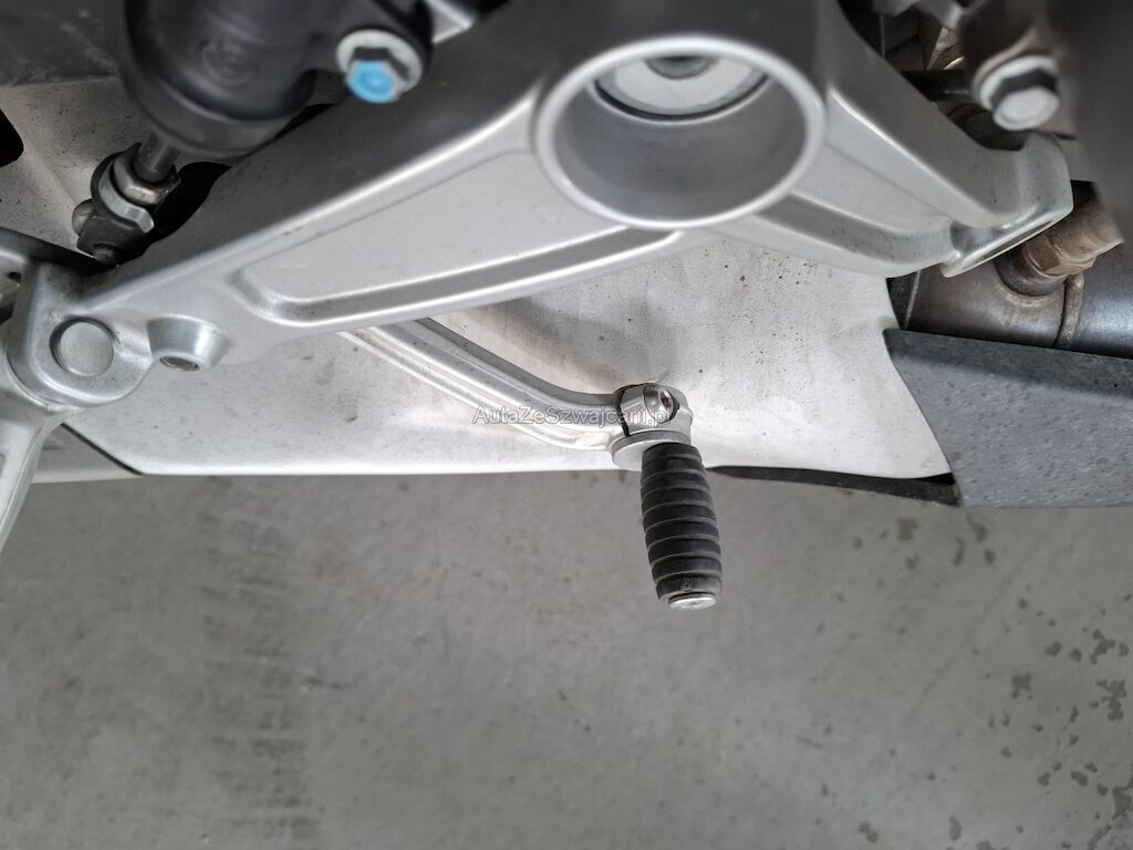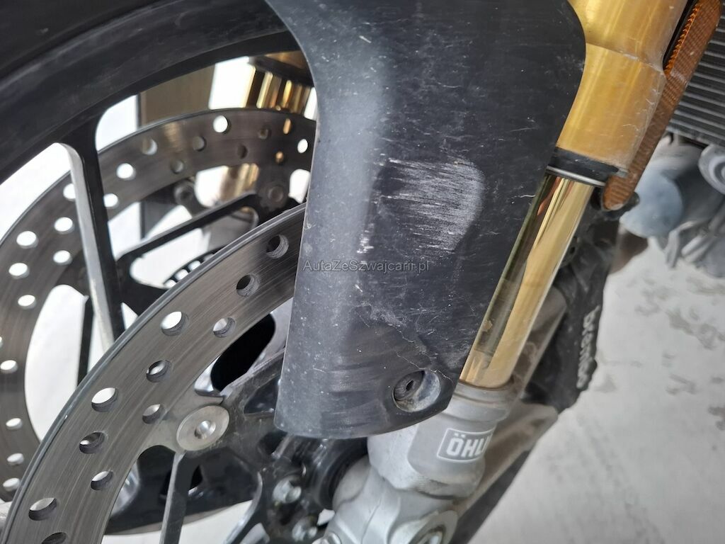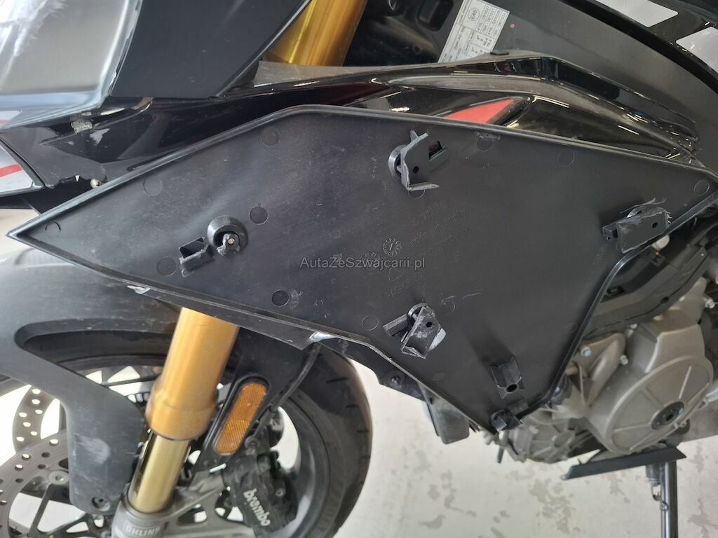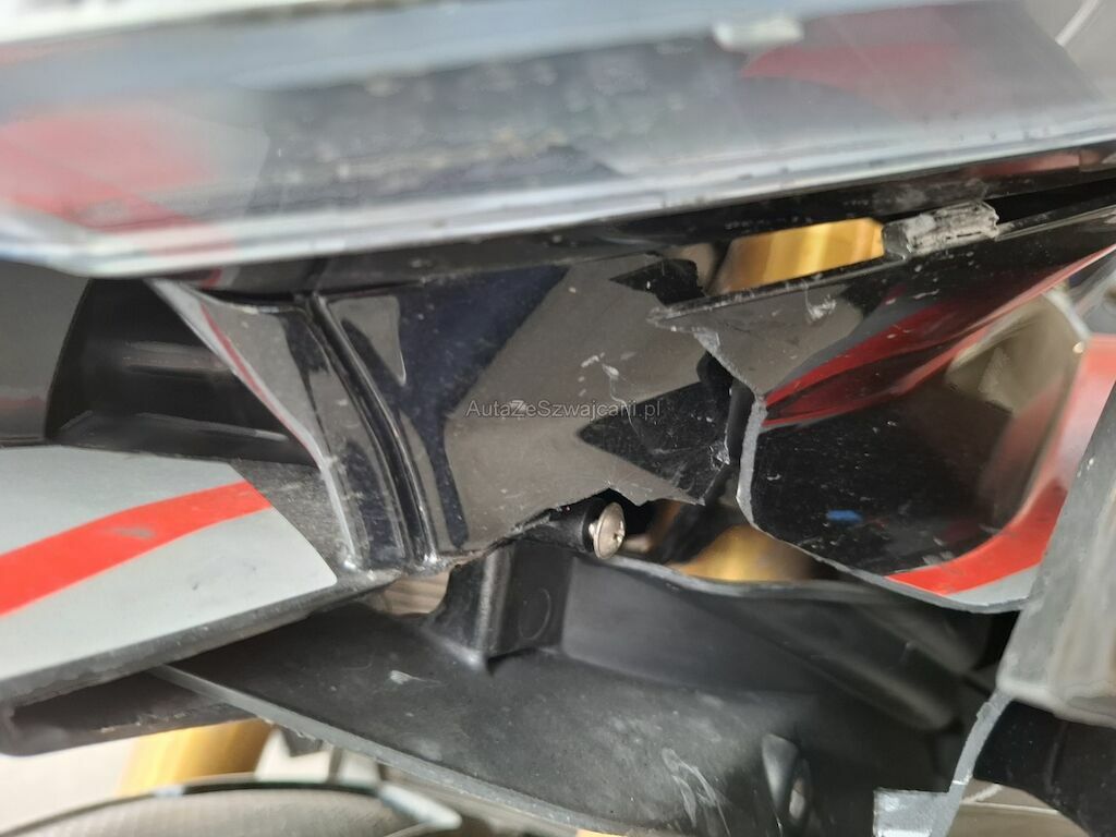 Dommage partie frontale et côtés: phare carénages et caches frontaux écope de radiateur gauche cassés fissurés éclatés arrachés endommagés, garde boue avant réservoir contre poid guidon gauche et droit rétroviseurs gauche et droit leviers de frein avant de d'embrayage rayés griffés frottés peinture et structure endommagées, pédale de frein arrière pliée déformée endommagée.