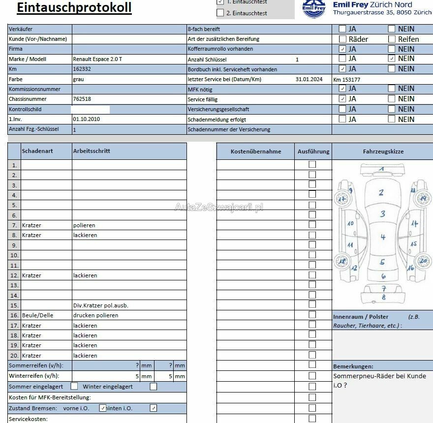 | Information | Keine Gewähr auf die Angaben der Sonder- und Serienausstattung / keine mechanische Prüfung. Fahrzeug wurde unzerlegt expertisiert / keine Haftung für allfällige, nach Demontage bekanntwerdenden Mängel. Fahrzeugbereifung und Ausstattung gemäss Fotos / Fahrzeugkauf auf eigenes Risiko ab Platz ohne Nachwährschaft. - Diverse Dellen und Kratzer am gesamten Fahrzeug - 4x Felgen haben Kratzer - Letzter Service am 31.01.2024 bei 153'177 Km |