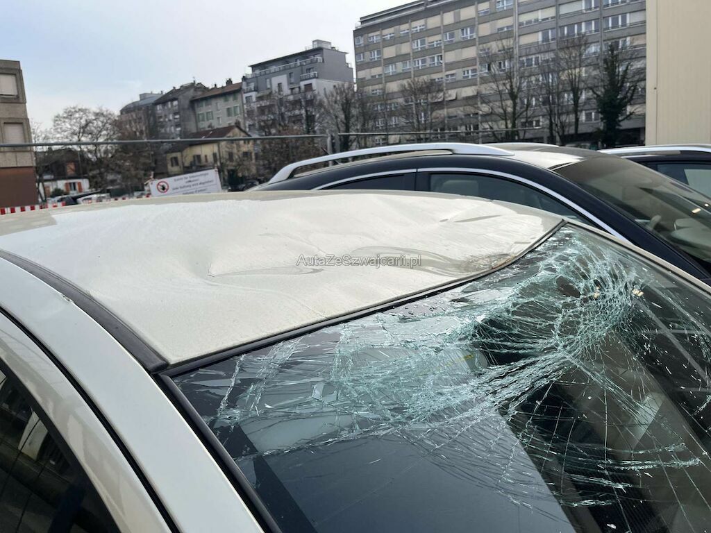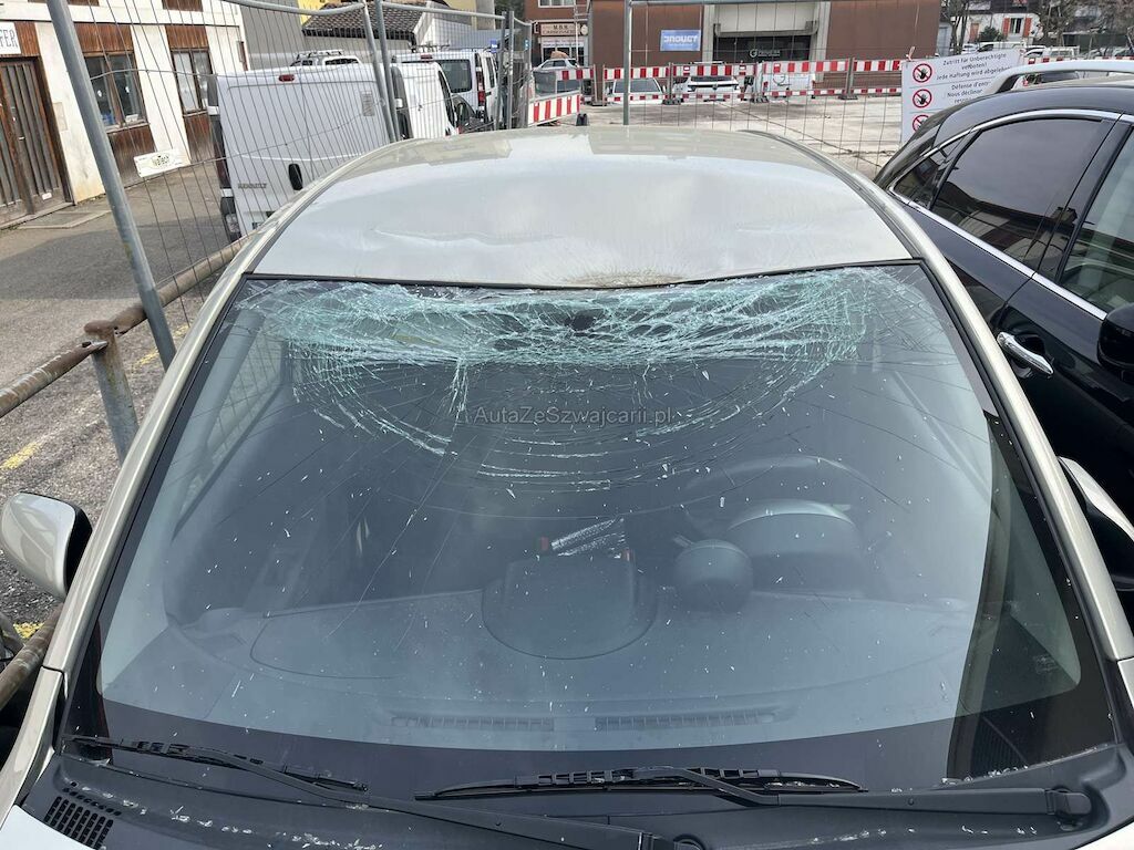 Choc sur le toit: Toit et pare-brise enfoncés et cassés.
