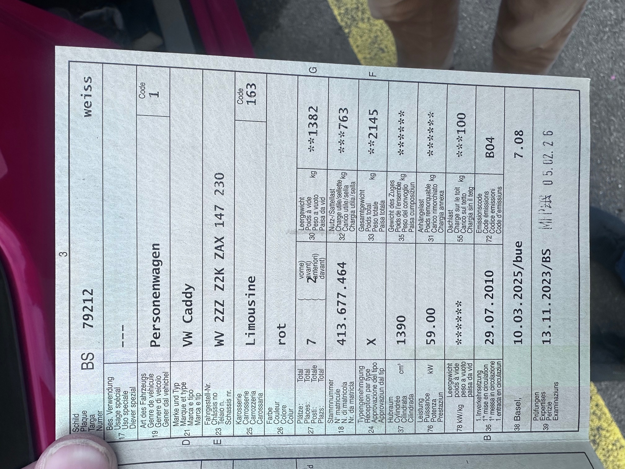 | Kommentar | Fahrzeug vor kurzem bei der MFK geprüft. Achtung. Zustand s fotos. Div carrosseriemängel. Letzter service fehlt. Nicht gestempelt im serviceheft. Gem kunde müsste aber mal ein service gemacht worden sein. Januar und februar viel am auto gemacht. S anhang. Foto Ab platz ohne garantie. Wir haben kenen WE Test gemacht und nicht alle funktionieren geprüft. Wandelung und minderung ausgeschlossen |