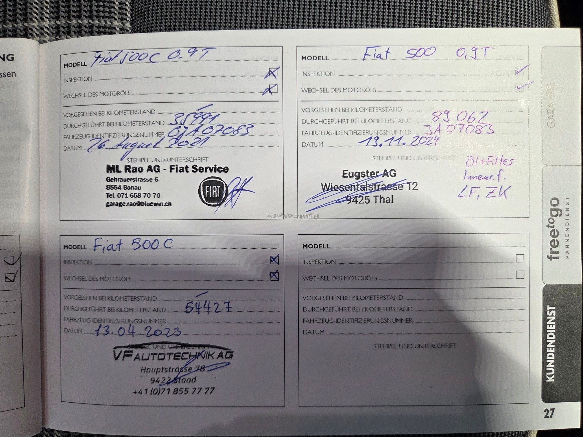 | Kommentar | Am Fahrzeug wurde keine genaue technische Prüfung durchgeführt! - sehr gepflegter Fiat 500 Cabrio - 8-fach befelgt (Profiltiefe Sommerreifen 6-7mm, Profiltiefe Winterreifen 6mm) - Service fällig - mehrere, kleinere Karrosserieschäden und Steinschläge (siehe Fotos) |