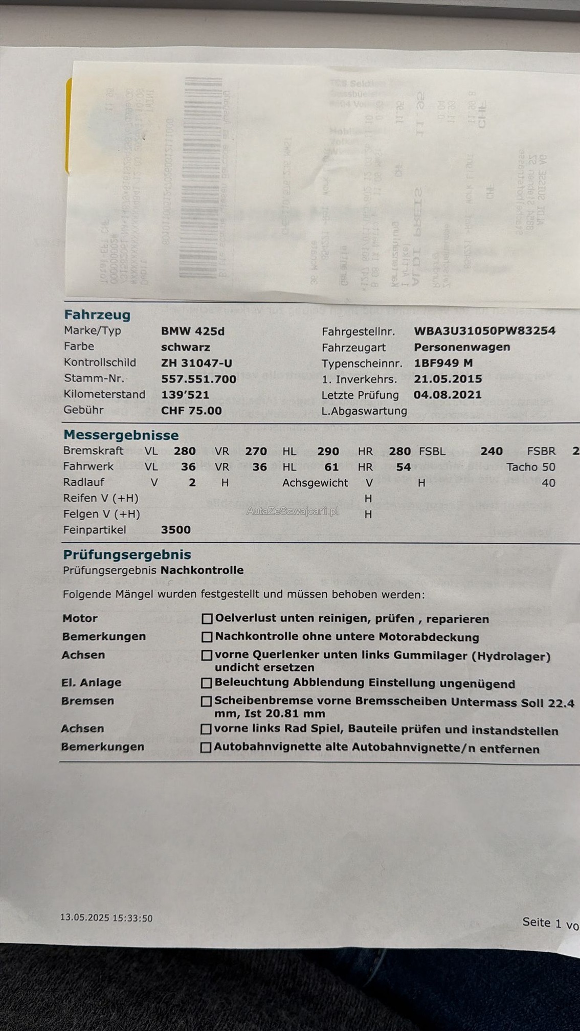 | Kommentar | Wurde seit der letzen MFK 400km bewegt, da der Kunde keine Zeit hatte sich darum zu kümmern. MFK-Bericht ist auf den Fotos hinterlegt. Felgen wurden frisch lackiert Das angebotene Fahrzeug wird ab Platz ohne Garantie und ohne jegliche Nachgewährschaft verkauft. Es handelt sich dabei um ein Eintausch Fahrzeug das div. Gebrauchsspuren und Mängel aufweist. Es wurde keine technischen Prüfung durchgeführt. Jede Gewährleistung, soweit nach Gesetz möglich, wird wegbedungen, insbesondere sind Wandelung und Minderung ausgeschlossen. |