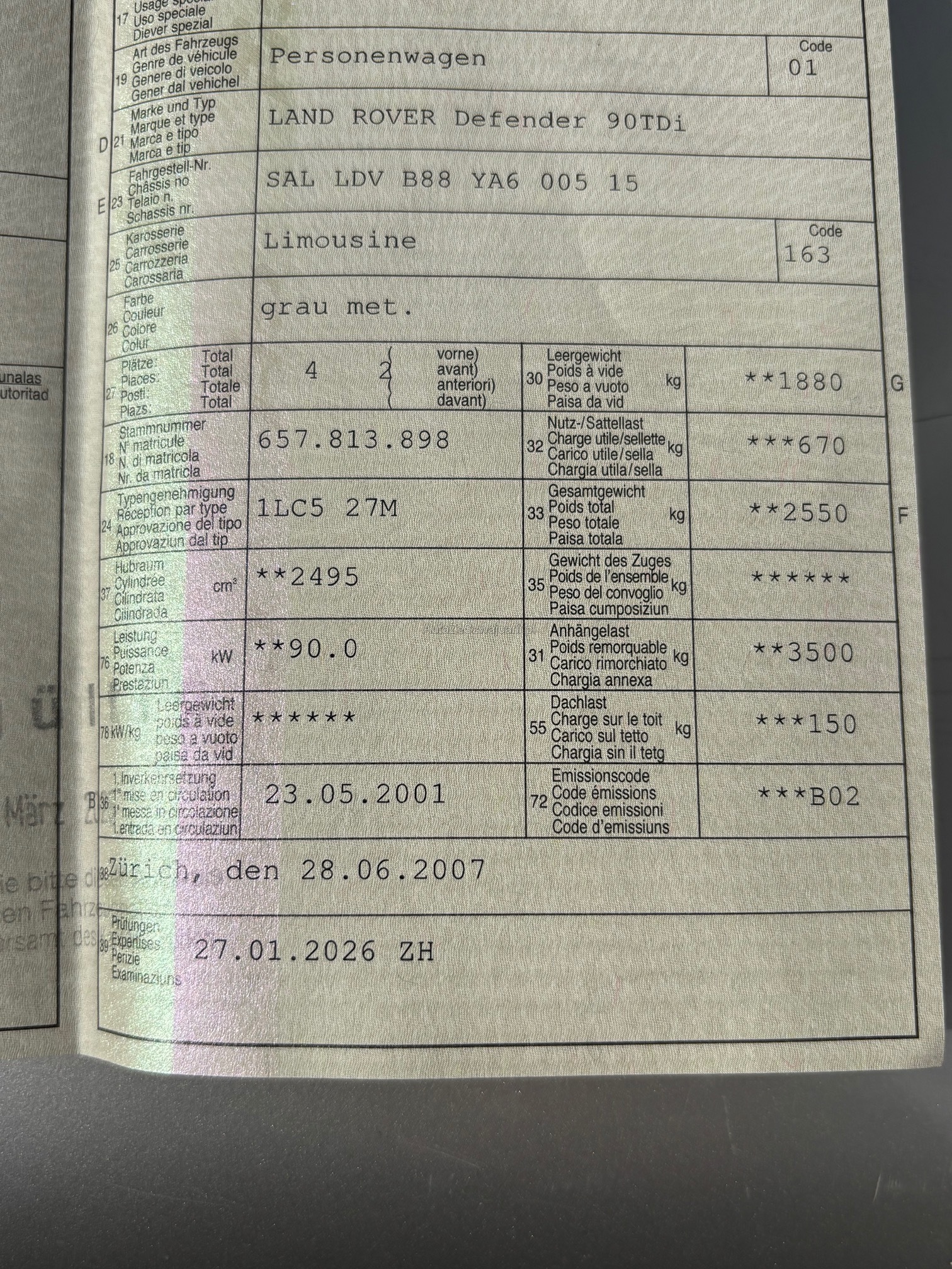 | Kommentar | Defender frisch ab MFK (27.01.2026) Für die MFK wurde sehr viel gemacht, unter Anderem: - beide Bremszangen, -scheiben und -beläge vorne ersetzt - diverse Bremsleitungen ersetzt - Spurstangengelenke - Stossdämpfer-Dom vorne rechts ersetzt - Wischergestänge, etc. Fahrzeug ist stark schmutzig (lief im Forstbetrieb) und hat diverse Beulen und Kratzer! Über Bodenwellen hört man ein schlagendes Geräusch (wie eine Stabilisatorstrebe). Ansonsten ist das Fahrzeug problemlos fahrbar und bereit für Hobby oder Arbeitsalltag. Der Landy verfügt über 3500kg Anhängelast und hat Kugel- und Hakenkupplung. Eingetragen sind 4 Sitzplätze, weitere Sitze gibt es dazu (war mal ein 6 Plätzer). Arbeitsscheinwerfer am Heck oben über separaten Schalter. Jede Gewährleistung, soweit nach Gesetz möglich, wird wegbedungen, insbesondere sind Wandelung und Minderung ausgeschlossen. |