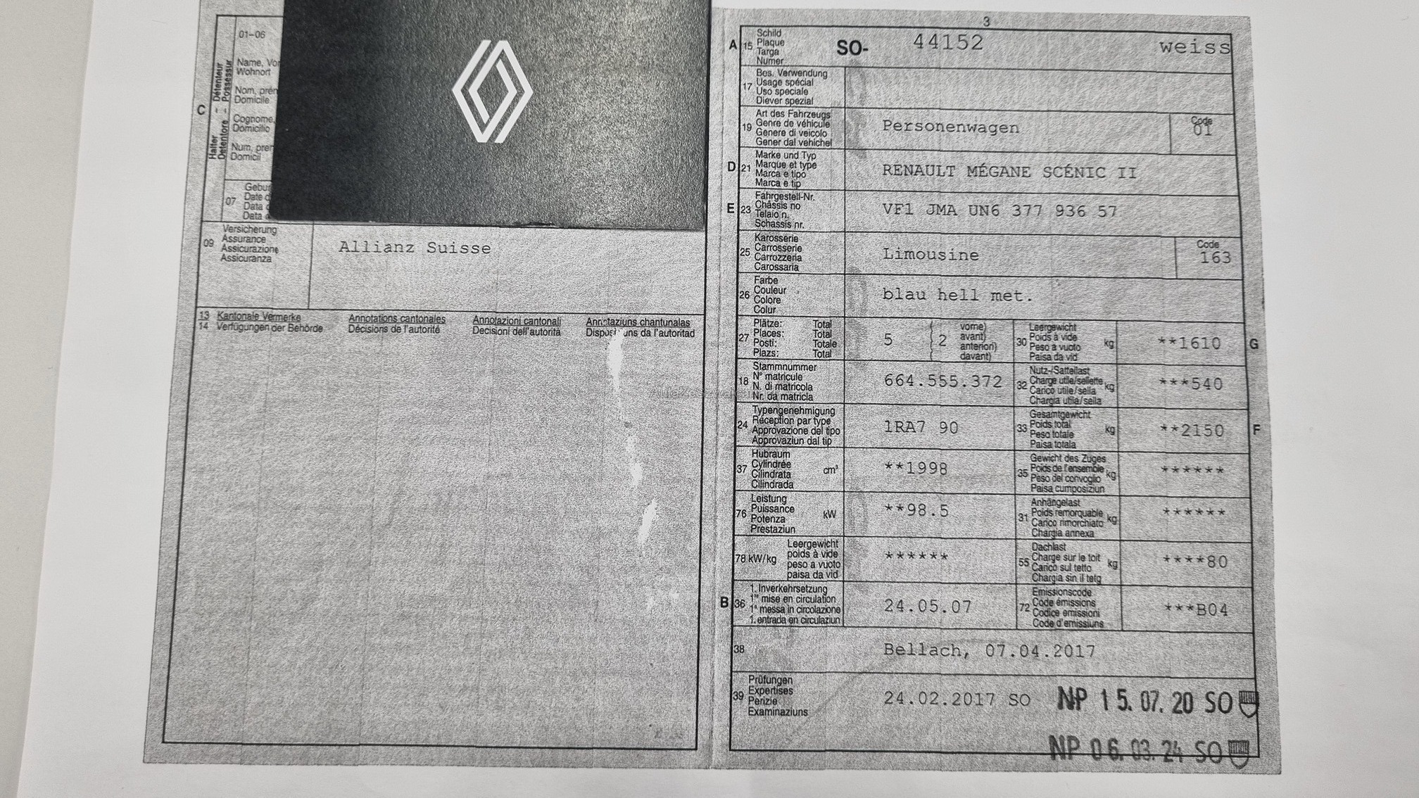 | Kommentar | Fahrzeug hat div. Carrosserieschäden gem Fotos. Fahrzeug wurde weder in der Werkstatt noch auf einer Probefahrt geprüft. Kundenwunsch 600.- |