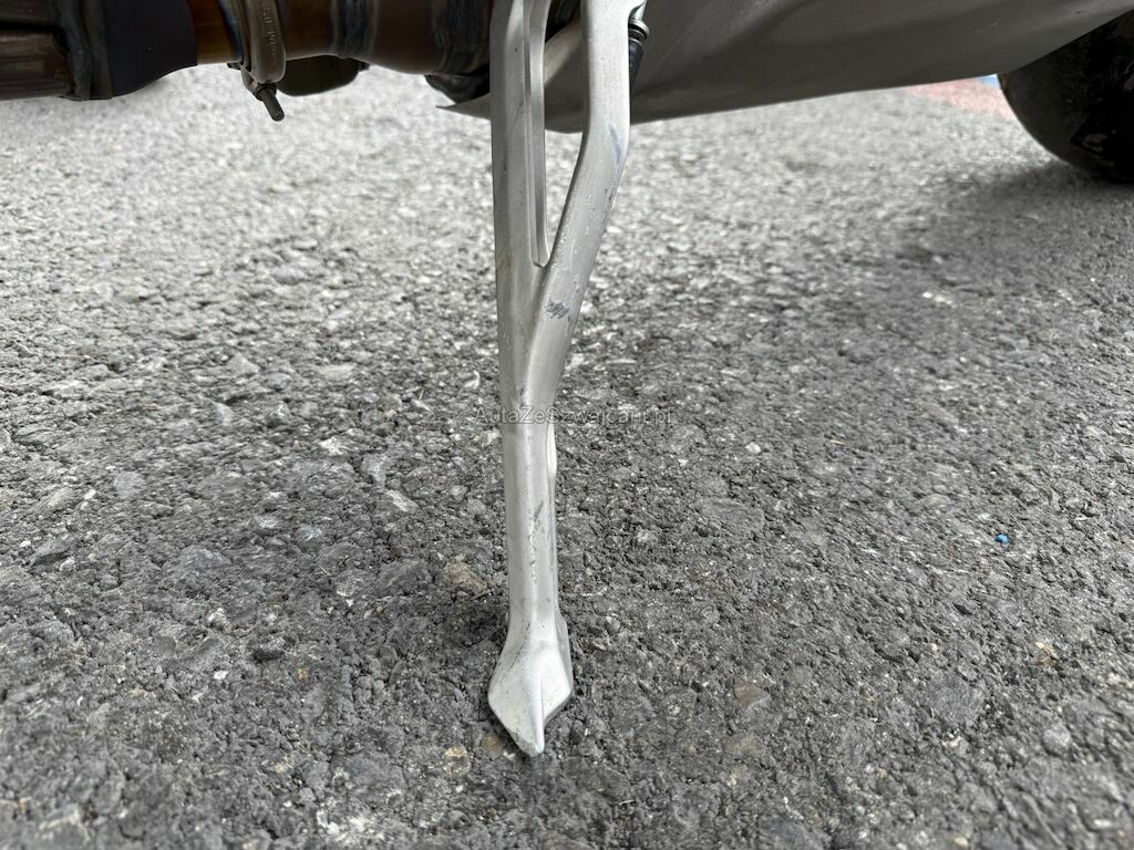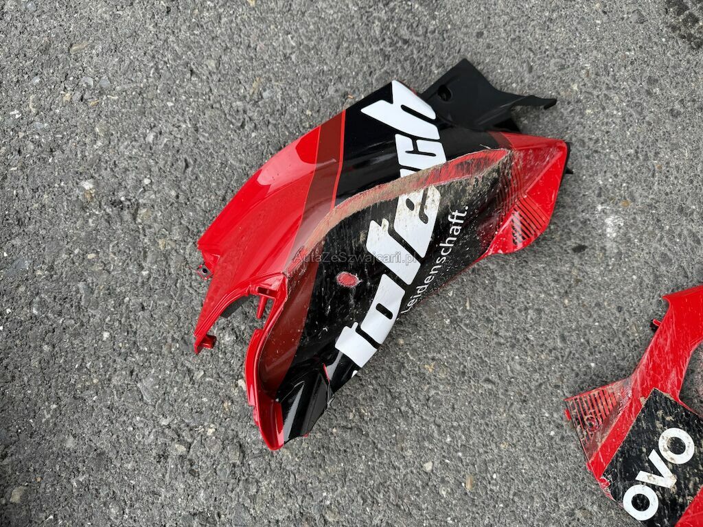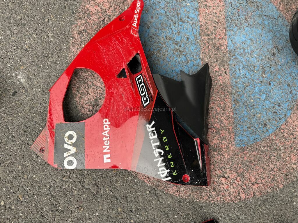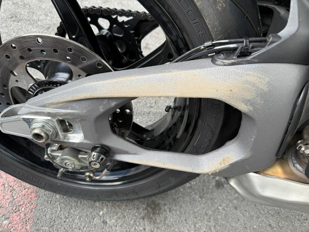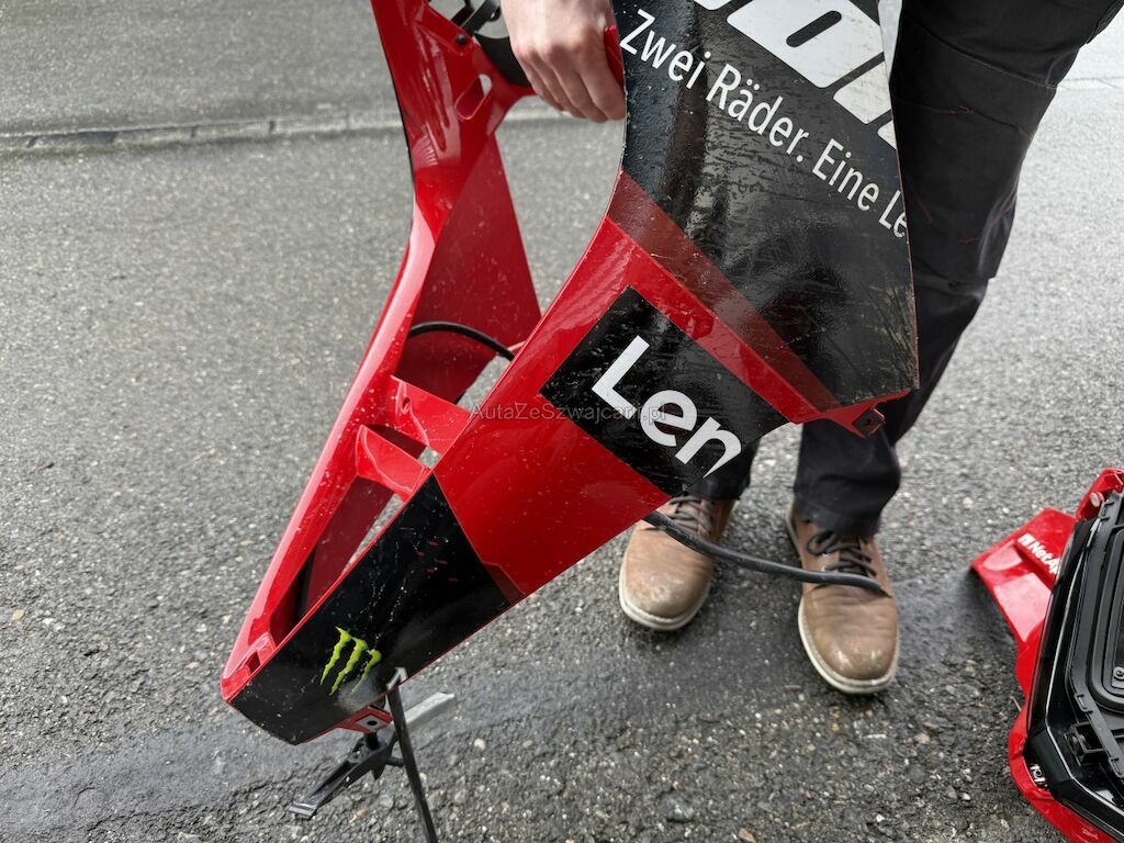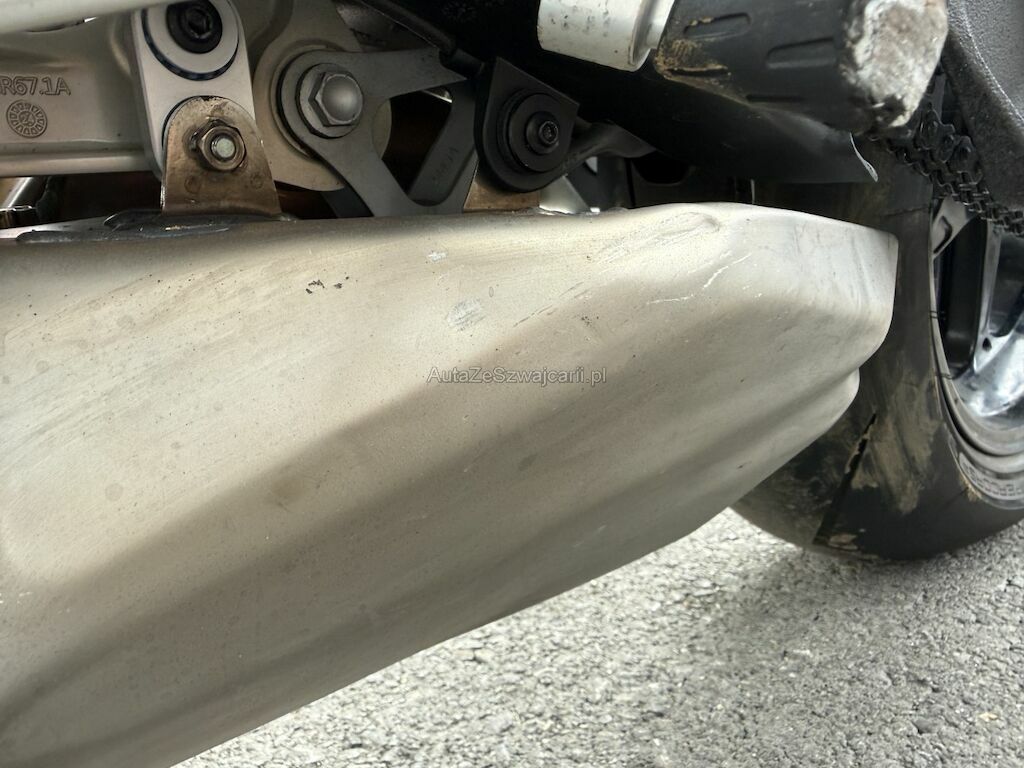 Beschädigung der Verkleidungen auf beiden Seiten sowie an Front und Heck. Deformation an der Vorderachse inklusive beider Gabeln, Gabelbrücke, Lenker, beiden Felgen, der Schwinge und dem Tank. Weiter Beschädigung an der Auspuffanlage, an den Kühlerelementen im Frontbereich, an der Feder sowie Bruch am Frontscheinwerfer.