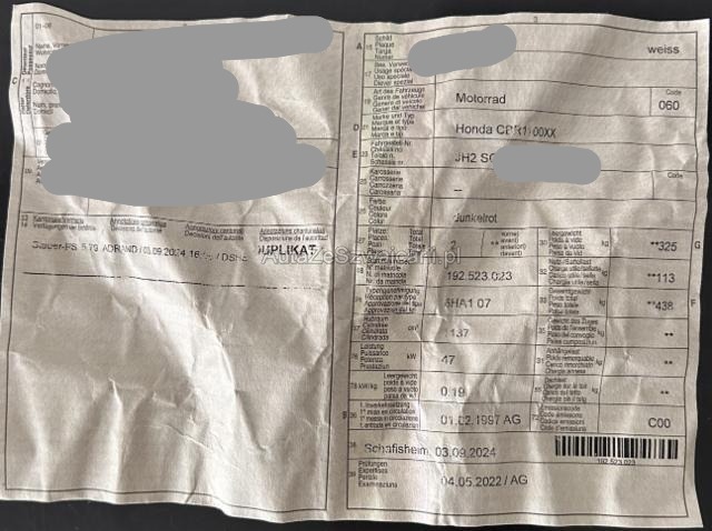 | Condition_and_Equipment | Zustand Fahrzeug muss transportiert werden (Höhe und Breite beachten). Fahrzeug ist NICHT fahrbar. Schlüssel Nur ein Schlüssel vorhanden. Zweirad-Kategorie Motorrad --- Links Linke Seite beschädigt. Motor Risiko Motor. Risiko Getriebe. Weitere Beschädigungen Fahrzeugfront eingedrückt. |