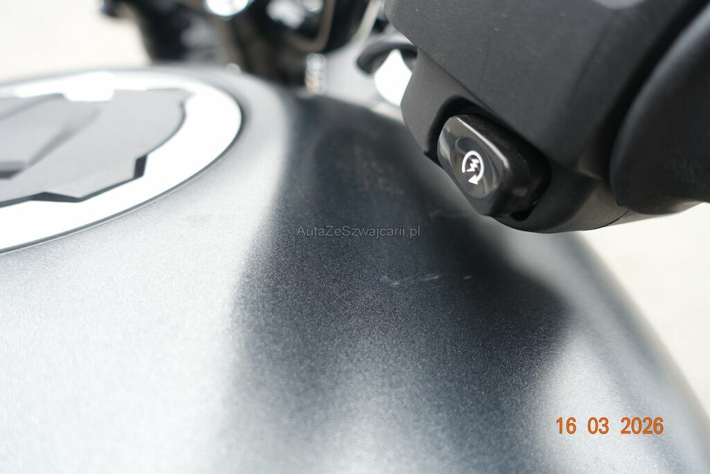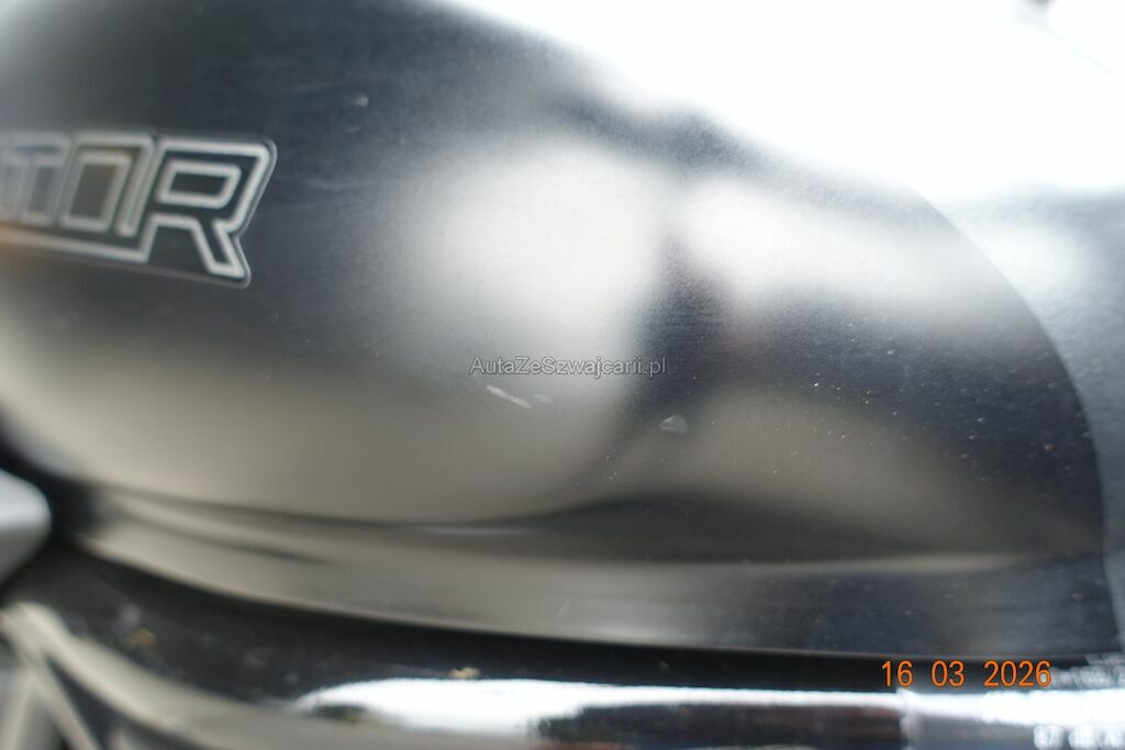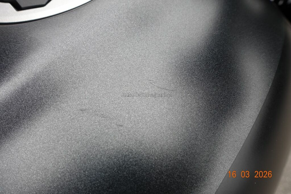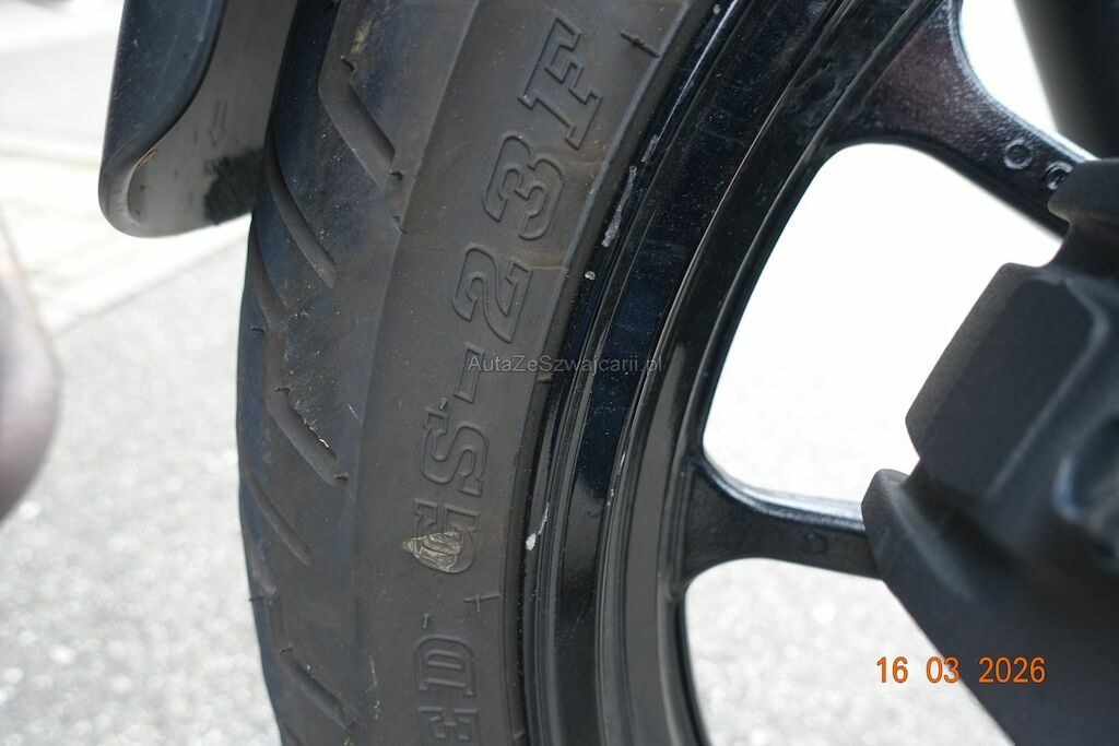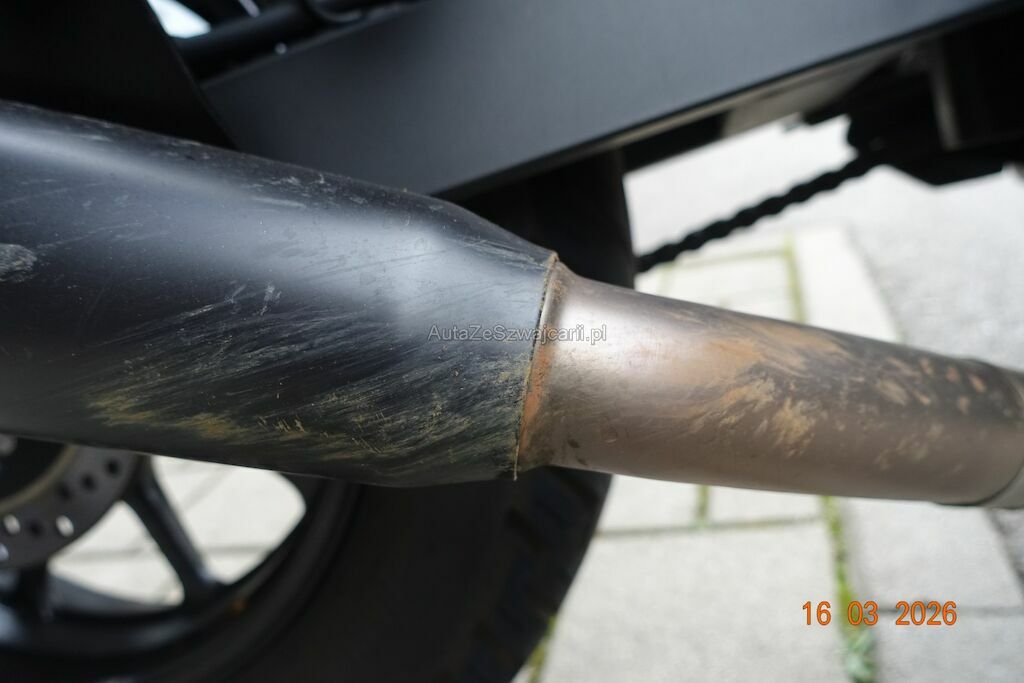 Die Felge vorne ist zerkratzt. Das Scheinwerfergehäuse sowie diverse Verkleidungen sind gebrochen. Der Lenker ist verbogen, dieser ist durch den Sturz an den Tank angestanden und hat zwei Dellen sowie Lackbeschädigungen verursacht. Der Auspuff ist zerkratzt